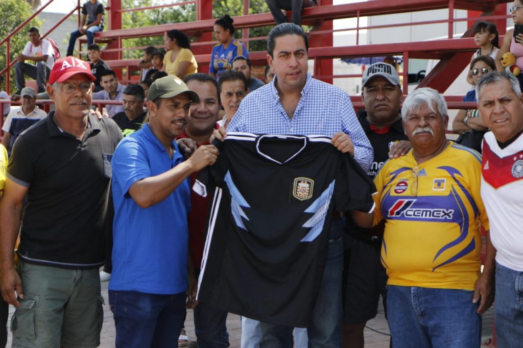 El alcalde de Ramos Arizpe, Chema Morales, en compañía de los directores de Deporte, Francisco Solís y Arturo Ramírez, y regidores del ayuntamiento, se dio cita en el Estadio de Fútbol en la Unidad Deportiva Eulalio Gutiérrez para hacer la entrega de uniformes a equipos de futbol.