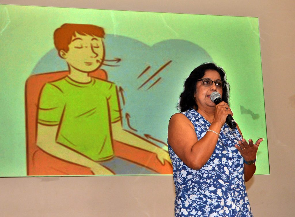 Para manejar el estrés, la terapeuta recomendó practicar dos tipos de respiración con los ojos cerrados: la diafragmática, en la que lentamente se dirige el aire hacia el estómago y se conserva ahí por un momento antes de soplar, y la inhalación y exhalación por la nariz hasta escuchar el paso del aire. “Repetir este tipo de respiraciones cinco veces seguidas ayuda a reducir la ansiedad”.