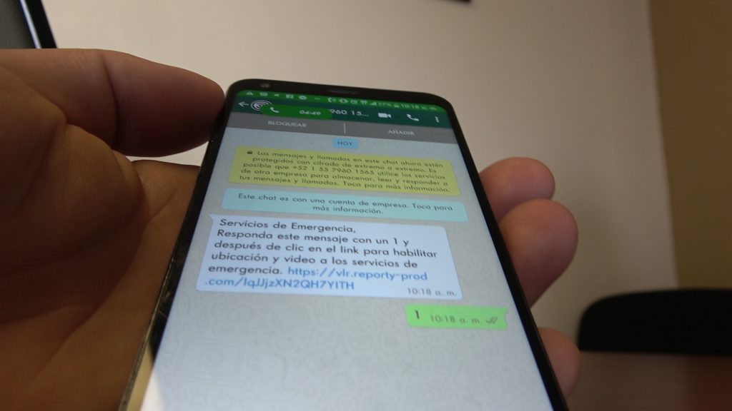 “Servicios de Emergencia. Responda este mensaje con un 1 y después de clic en el link, para habilitar ubicación y video a los servicios de emergencia”, señala el texto enviado por Whatsapp.