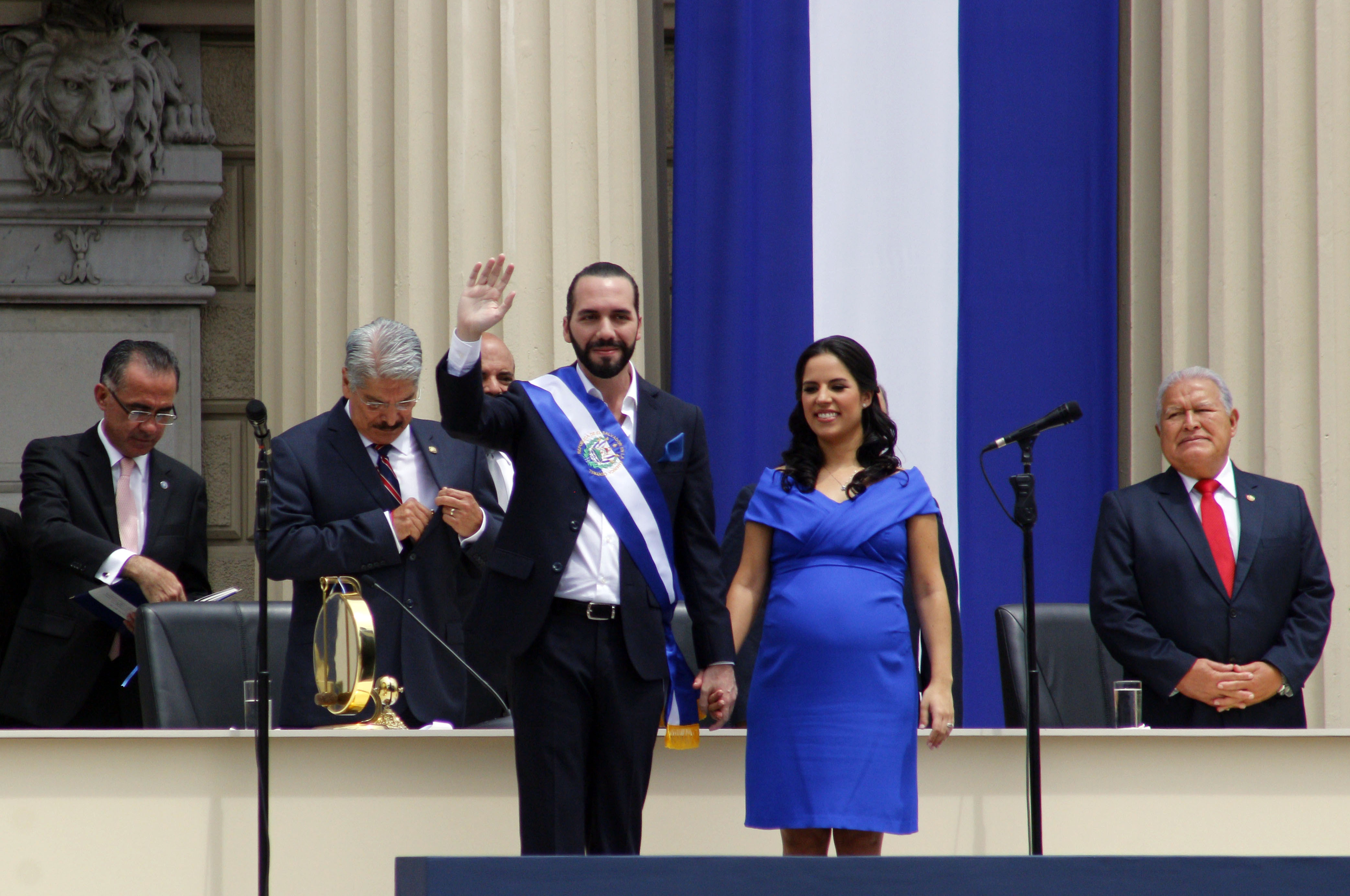 En sesión solemne de la Asamblea Legislativa en la céntrica plaza, el nuevo presidente besó a su esposa, Gabriela Rodríguez de Bukele, apenas tomó protesta y saludó a la multitud que se dio cita para atestiguar el momento.
