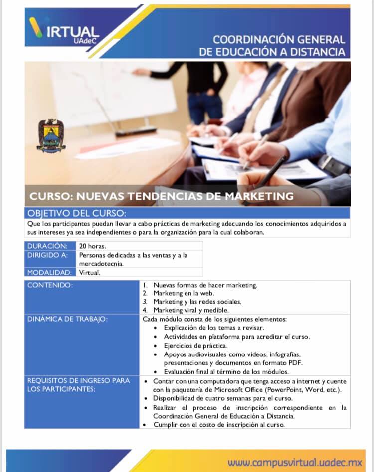 La Coordinación General de Educación a Distancia de la Universidad Autónoma de Coahuila, invita a tomar el curso “Nuevas Tendencias de Marketing” que dará inicio este miércoles, pero con posibilidad de incorporarse hasta el viernes 7 de junio.