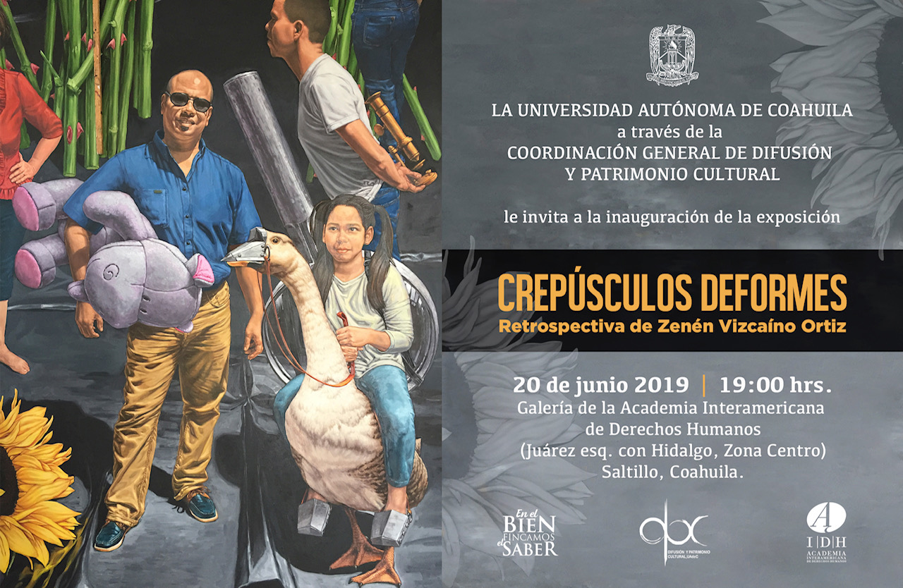 El jueves 20 de junio a las 19:00 horas en la galería de la Academia Interamericana de Derechos Humanos, ubicada en la calle Juárez e Hidalgo del Centro Histórico, se inaugura la exposición retrospectiva “Crepúsculos Deformes” del Maestro Zenén Vizcaíno Ortiz. La muestra está compuesta por 30 piezas y reúne obras representativas, así como obra reciente de gran formato, todas con el estilo único del artista.
