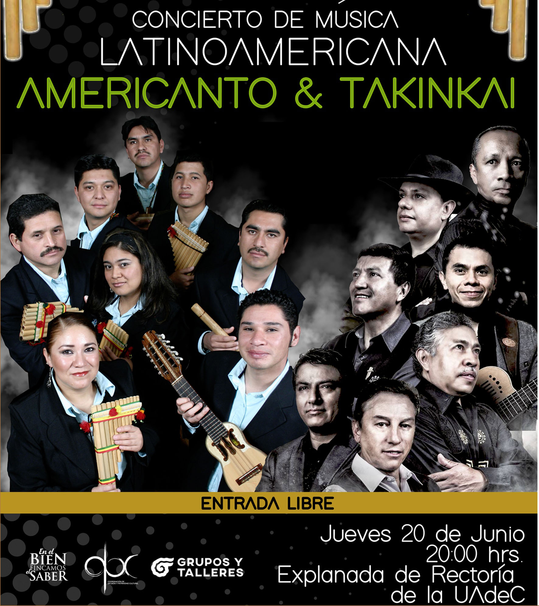 El mismo día a las 20:00 horas en la explanada de rectoría se presentará el concierto de música folclórica y latinoamericana en un mano a mano entre dos emblemáticas agrupaciones musicales de la UA de C: Takinkai y el grupo Americanto. La entrada es libre.