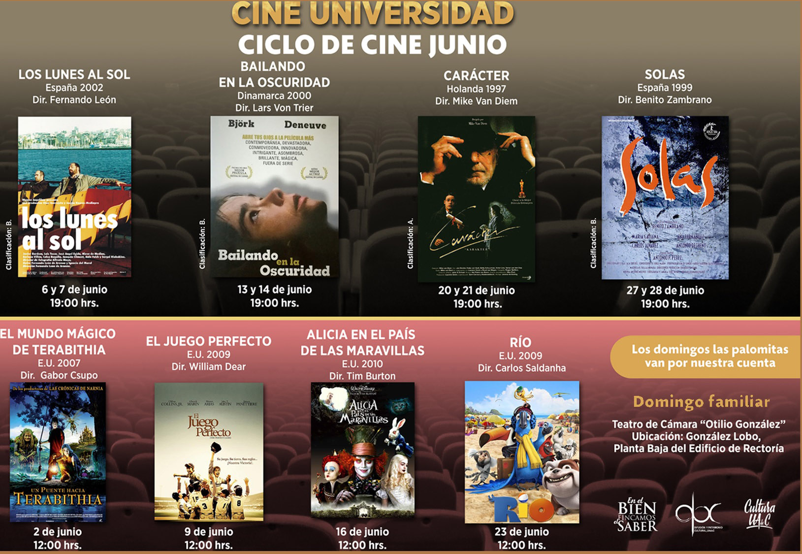 Cine Universidad inicia su ciclo del mes con la proyección de “Los lunes al sol” el 6 y 7 de junio; “Bailando en la Oscuridad” 13 y 14 de junio; “Carácter” 20 y 21 de junio; “Solas” 27 y 28 de junio. Las funciones son a las 19:00 horas en el teatro de cámara “Otilio González”, ubicado en la planta baja del edificio de rectoría, la entrada es libre.