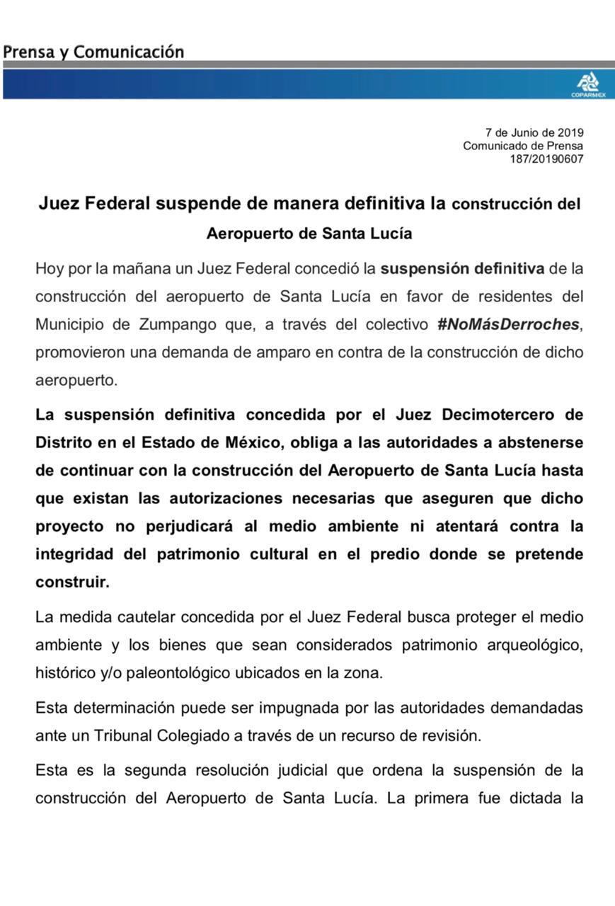 «Hoy por la mañana, un juez federal concedió la suspensión definitiva de la construcción del aeropuerto de San Lucía en favor de residentes del municipio de Zumpango que, a través del colectivo #NoMásDerroches, promovieron una demanda de ampara en contra de la construcción de dicho aeropuerto», informó a través de un comunicado publicado en Twitter.