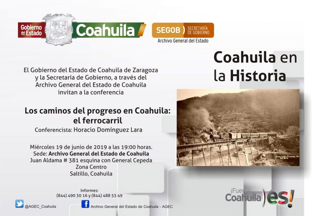Este miércoles a las 7:00 de la tarde se impartirá en el Archivo General del Estado (Aldama 381. Centro Histórico), la conferencia «Los Caminos del Progreso en Coahuila: el Ferrocarril» por Horacio Domínguez Lara, presidente de la Asociación de Historiadores y Cronistas de la entidad.