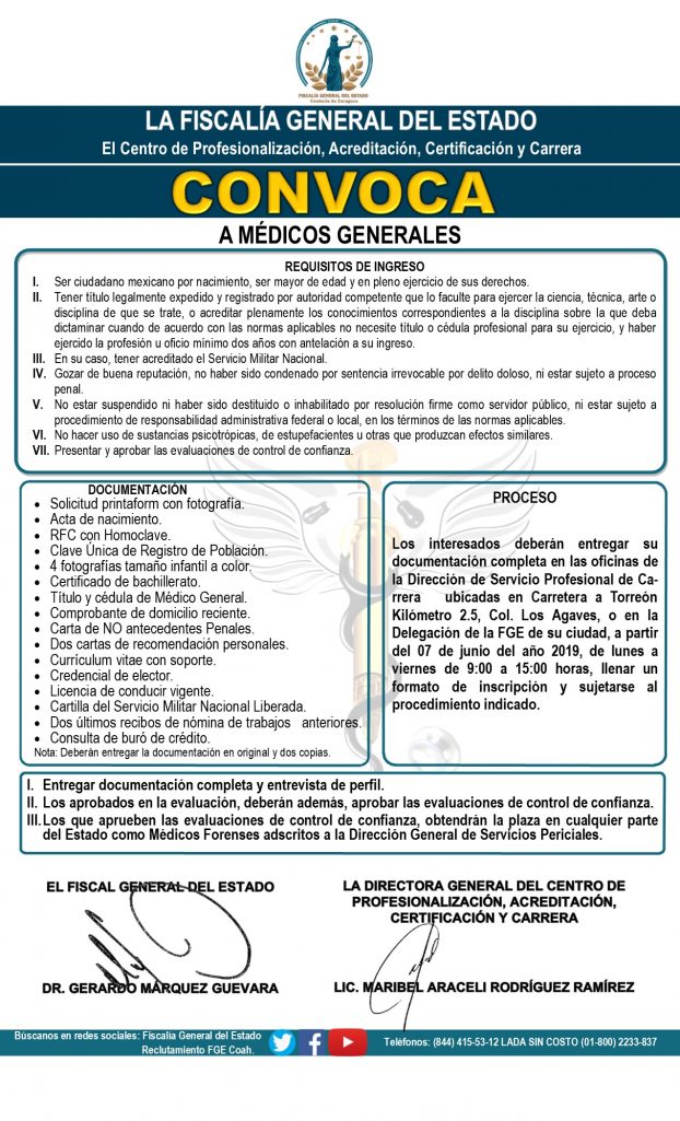 La Fiscalía General del Estado de (FGE) convoca a Médicos Generales y aspirantes a Agentes de Investigación Criminal para integrarse a la plantilla laboral.