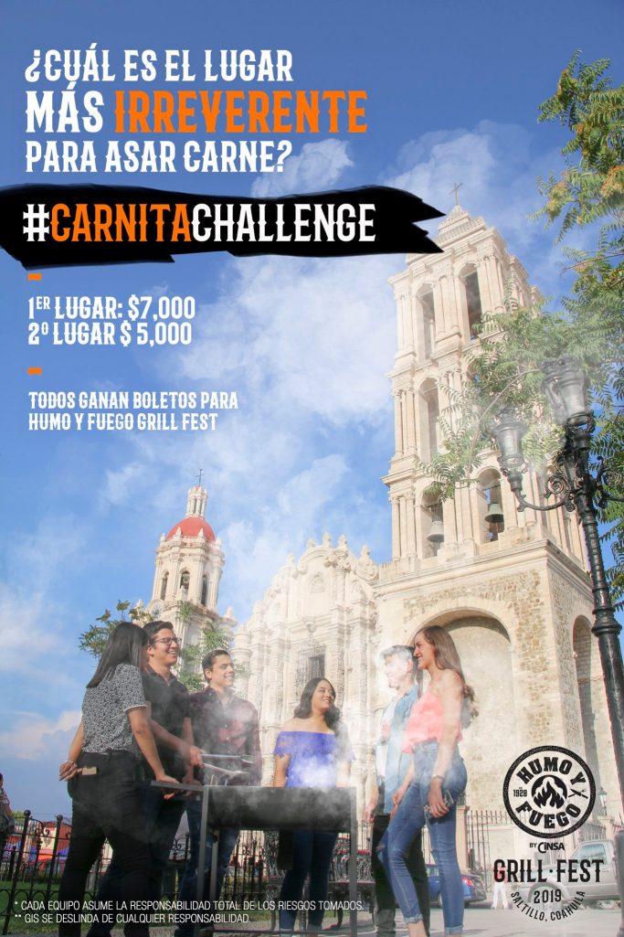 Previo a la realización −este próximo 29 de junio en las instalaciones de la Feria Saltillo− del Humo y Fuego Grill Fest, Cinsa invita a los parrilleros de corazón a participar en el concurso #CarnitaChallenge, que consiste en grabar un video de 15 segundos y hasta minuto y medio, preparando un corte de carne a la parrilla en cualquier lugar irreverente o poco común, con la participación de mínimo tres personas y máximo 10.