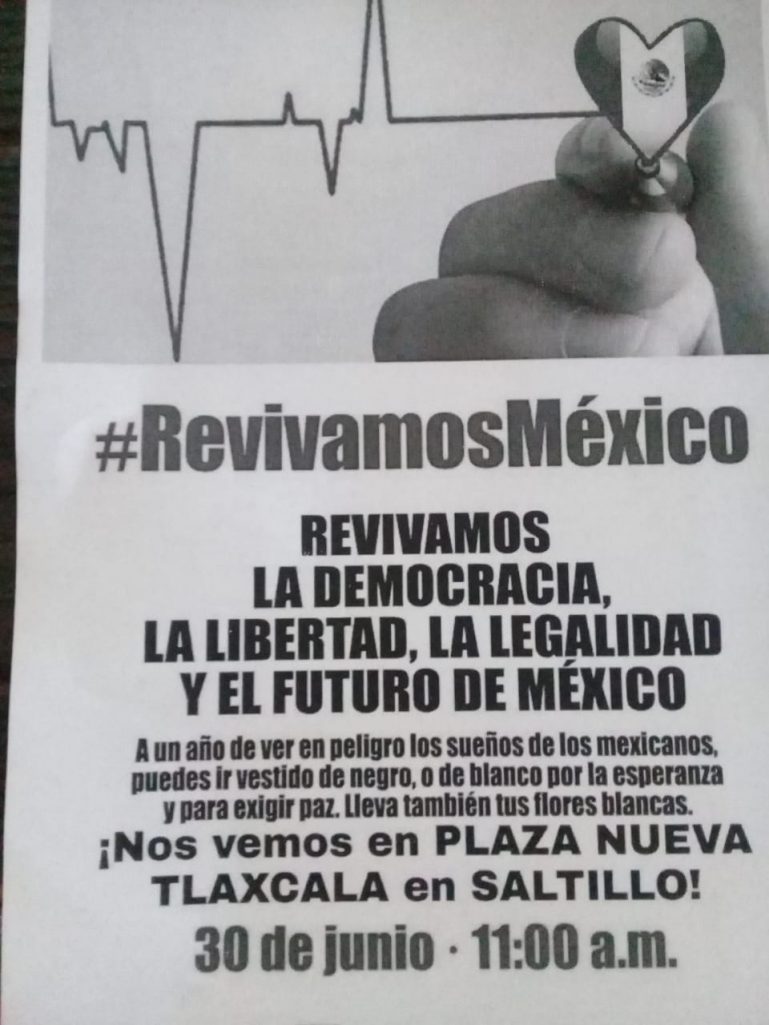 En Saltillo la convocatoria es en la Plaza Nueva Tlaxcala, a espaldas del Palacio de Gobierno, en punto de las 11 de la mañana. Los organizadores sugieren ir vestidos de negro o de blanco, y llevar flores de éste último color. (CON INFORMACIÓN DE EL DIARIO MX)