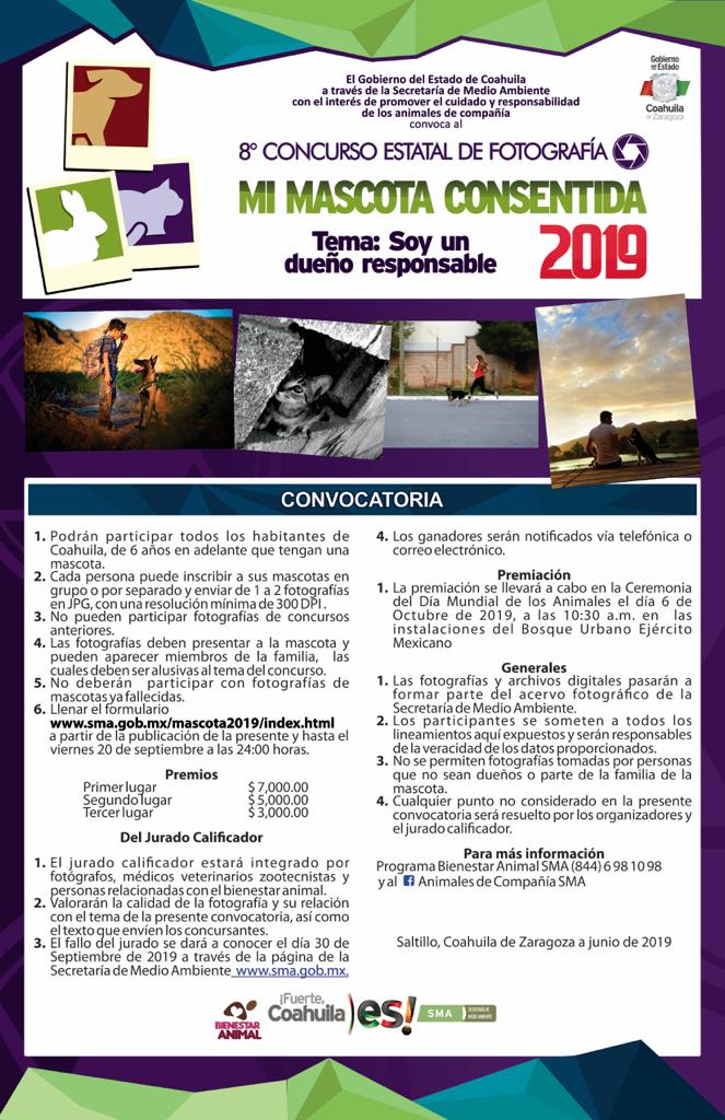 Con el propósito de promover la responsabilidad y el cuidado hacia los animales de compañía, el Gobierno del Estado de Coahuila, a través de la Secretaría de Medio Ambiente, convoca a la población a participar en el 8° Concurso Estatal de Fotografía “Mi Mascota Consentida”, con el tema “Soy un Dueño Responsable”.