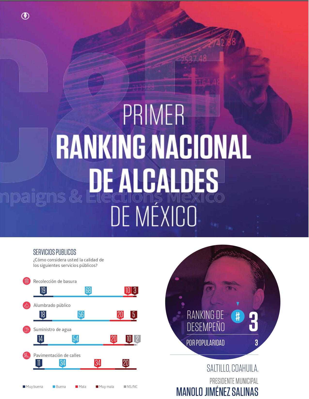 A través de la encuesta nacional realizada por Campaings & Elections, en la que se midió el desempeño y popularidad de los alcaldes mexicanos, el munícipe de Saltillo, Manolo Jiménez Salinas, se colocó en tercer lugar nacional en ambos rubros, y en el primero del norte del país.