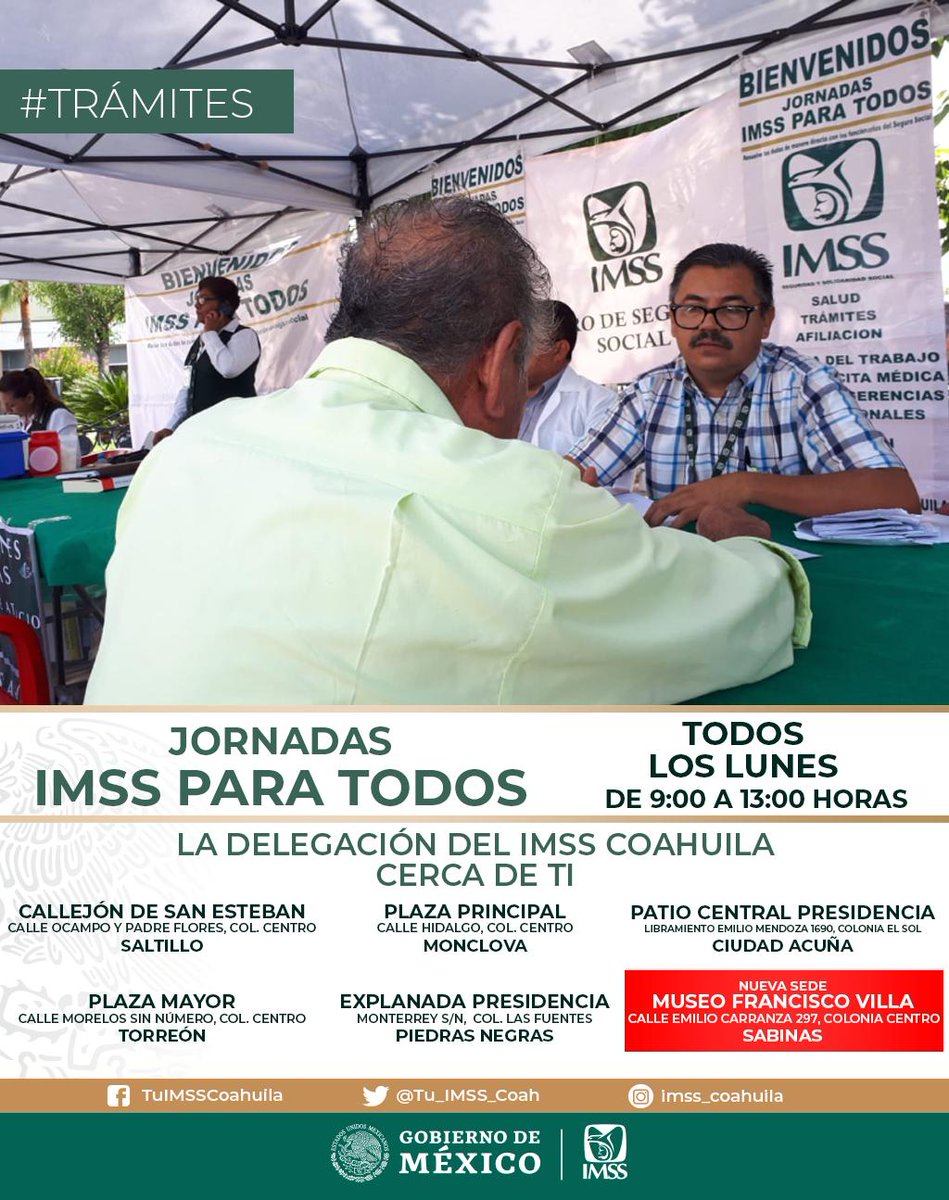 Este próximo lunes, en las subdelegaciones de Monclova, Torreón, Piedras Negras, Ciudad Acuña, Sabinas y Saltillo, continúan las jornadas IMSS Para Todos, abiertas al público en general que desee orientación sobre trámites médicos y administrativos tales como citas, estudios de gabinete o derivación con especialistas, información sobre pensiones, número de seguridad social e incluso quejas.
