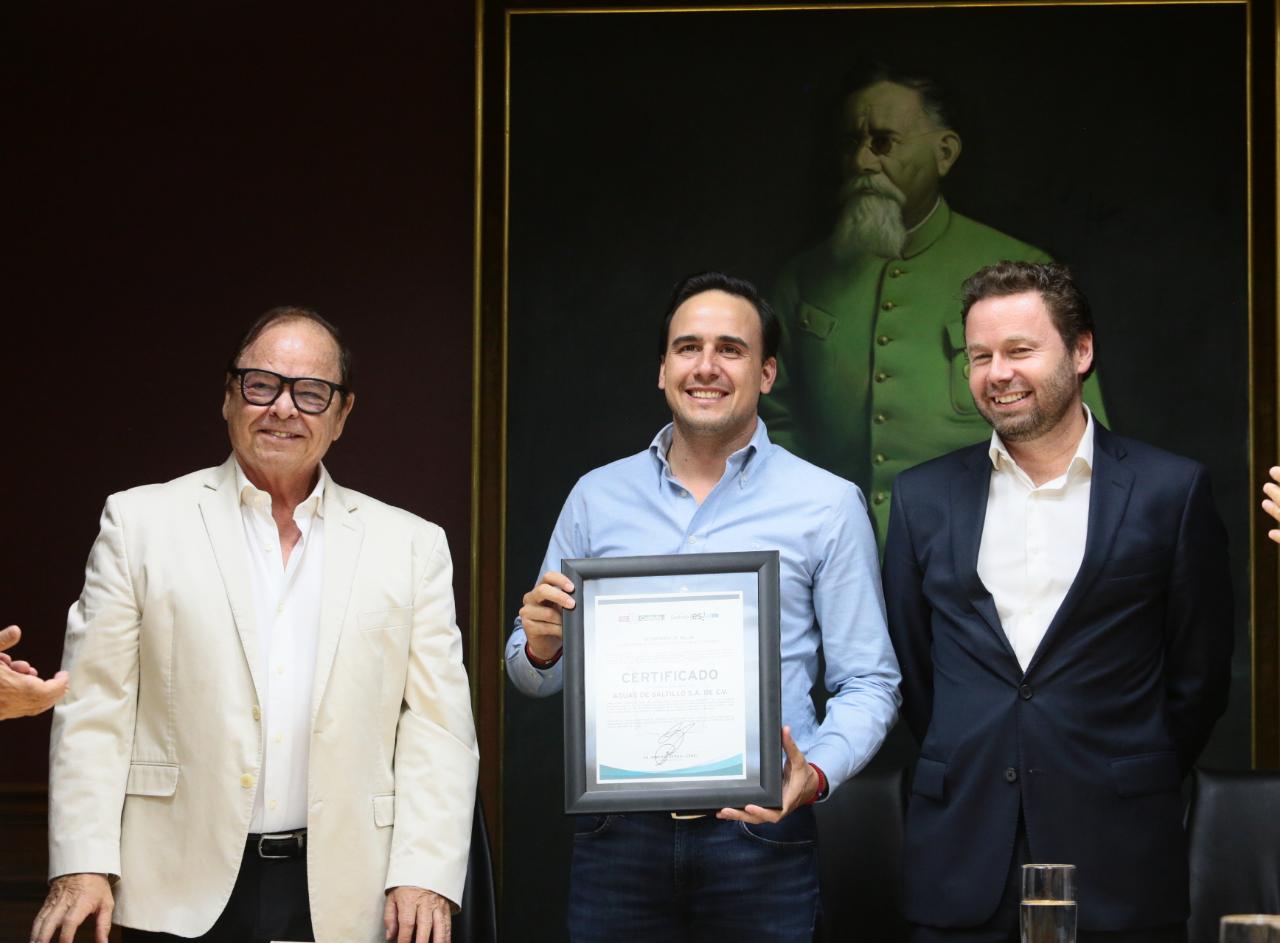 Por haber cumplido con las condiciones sanitarias del sistema, de calidad bacteriológica y físico química del agua, el Gobierno del Estado, a través de la Secretaría de Salud, entregó la certificación a la empresa Paramunicipal Aguas de Saltillo SA de CV.