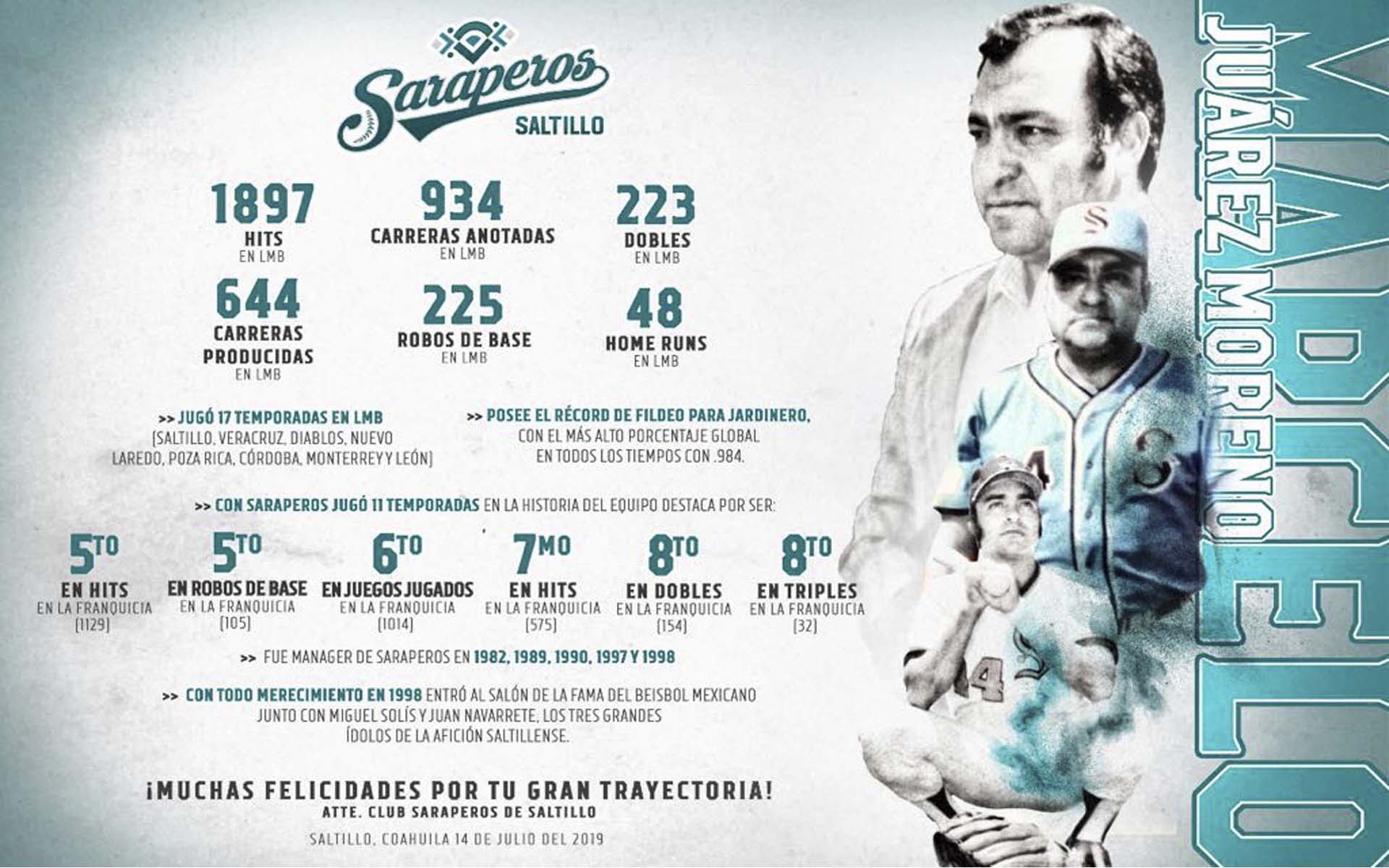 Hablar de Marcelo Juárez Moreno, es hablar de uno de los mejores jardineros en la historia del Béisbol Mexicano, oriundo de Río Bravo, Coahuila, pero avecindado en la capital donde forjó una gran carrera con Saraperos y formó a su familia.
