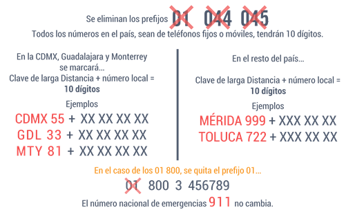 Para las llamadas a números celulares, se eliminarán los prefijos 044 y 045, y también se marcarán a 10 dígitos, no importando si el enlace se hace desde un número fijo o móvil en cualquier parte del país; mientras que en los números 01 800, se eliminará el prefijo 01. El número de emergencia nacional 911 no sufrirá cambios en su marcación.