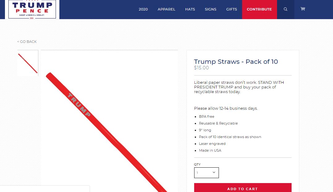 A través de la página oficial de la campaña de Donald Trump para las elección del 2020 se puede ver la venta de los popotes de plástico.