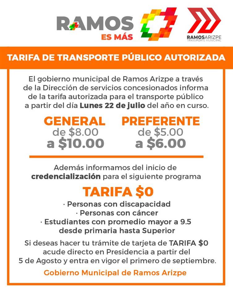 El director de servicios concesionados del Ayuntamiento de Ramos Arizpe, Francisco Vázquez Ramos, dio a conocer que la tarifa general pasará de 8 a 10 pesos, mientras que la preferente será de 5 a 6 pesos.
