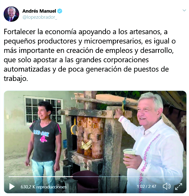 Durante la visita que esta semana realizó al Municipio de Huejutla de Reyes, en el estado de Hidalgo, López Obrador difundió un video en el cual afirma que su gobierno fortalece lo que denominó como «economía popular», apoyando a los pequeños productores, en detrimento a las grandes empresas, las cuales según él, generan muy pocos puestos de trabajo.