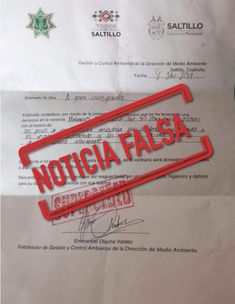 El documento apócrifo, que circula en redes sociales, hace referencia a una presunta notificación que hizo la Policía Ambiental respecto a unos perros agresivos reportados en la calle de Matamoros, sin embargo, se reiteró la falsedad de ese aviso.
