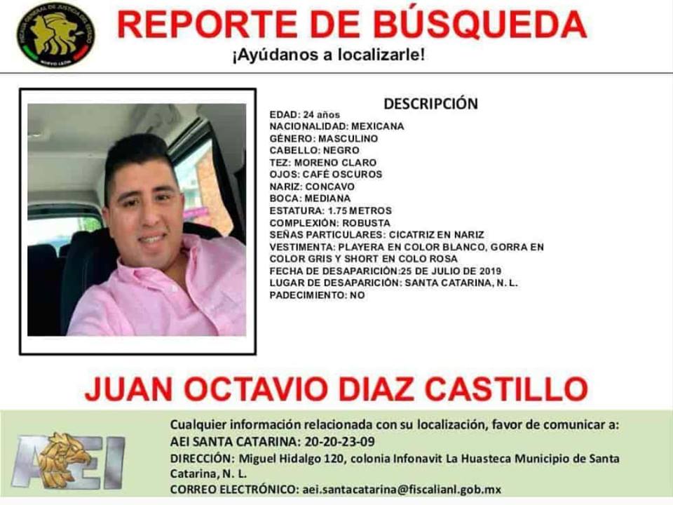 Juan Octavio Díaz Castillo, desapareció el pasado jueves 25 de julio, luego de que pidiera apoyo a través de Facebook, indicando que se le había averiado su auto en la carretera a Saltillo.
