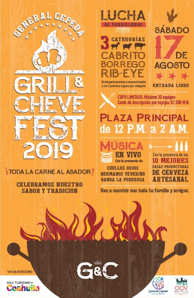 El próximo 17 de agosto desde las 12:00 del mediodía, la Plaza Principal de General Cepeda se vestirá de humo y fuego parrillero gracias a la emisión del Cheve and Grill Fest 2019, que llegará a este municipio con un ambiente 100 por ciento familiar.