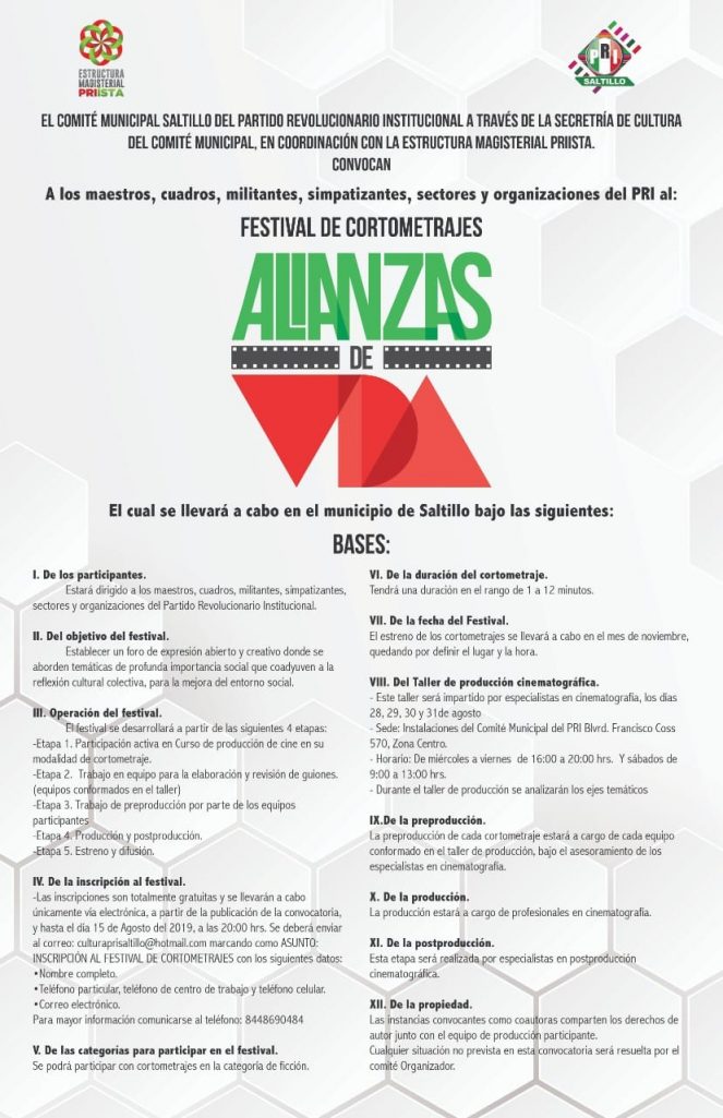 Con la intención de generar apertura y propuestas en relación al mejoramiento social, el Comité Municipal Saltillo del Partido Revolucionario Institucional (PRI), a través de su Secretaría de Cultura, y en coordinación con la Estructura Magisterial Priísta, organiza el Festival de Cortometrajes Alianzas de Vida, que se integrará por trabajos fílmicos de maestros, cuadros locales, militantes, simpatizantes de este organismo político y demás ciudadanía.