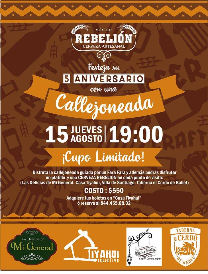 Para celebrar su quinto aniversario, la marca saltillense de cerveza artesanal «Rebelión», realizará este próximo 15 de agosto iniciando a las 7:00 de la tarde, una callejoneada en la que sus participantes visitarán bares y restaurantes del Centro Histórico como Las Delicias de Mi General, Casa Tiyahui, Villa de Santiago y Taberna El Cerdo de Babel, para disfrutar de su gama de presentaciones, acompañada de platillos que cada establecimiento ofrecerá.