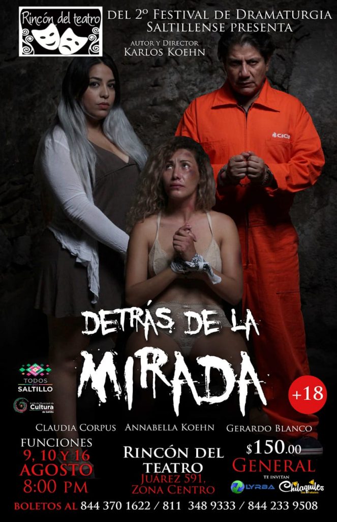 La obra Detrás de la Mirada, que retrata en su trama la violencia en México, se presentará en el Rincón del Teatro (Juárez 591. Centro Histórico), los días 9, 10 y 16 de agosto, a las 8:00 de la noche.