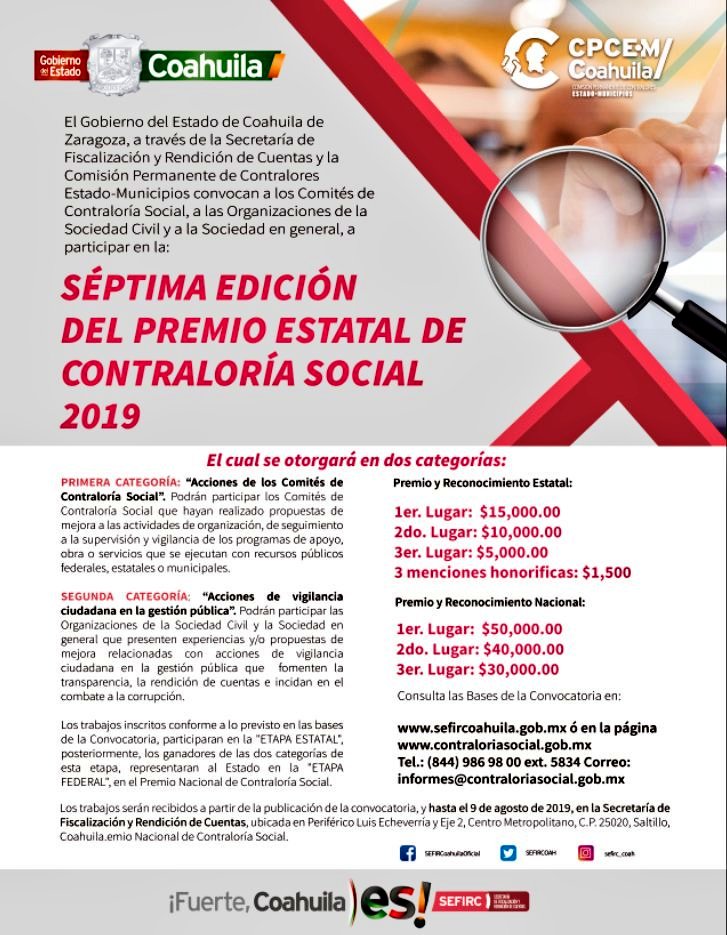 El Gobierno de Coahuila y su Secretaría de Fiscalización y Rendición de Cuentas (SEFIRC) recuerdan que este viernes 9 de agosto concluye la convocatoria para la recepción de proyectos para la Séptima Edición del Premio Estatal de Contraloría Social 2019.
