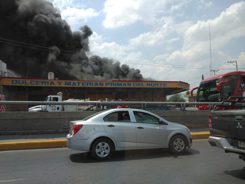 Un voraz incendio consume al momento el negocio denominado Dulcería y Materias Primas del Norte, que se ubica sobre Luis Echeverría Álvarez, en la colonia San Ramón, frente al Mercado de Abastos.