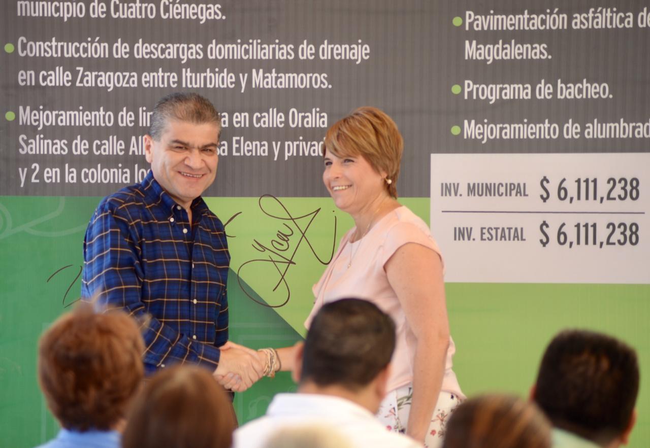 Al visitar Cuatro Ciénegas, el Mandatario Estatal informó que junto a la alcaldesa Yolanda Cantú Moncada, se invierten 2.4 millones de pesos en obras de pavimentación de cinco mil 700 metros cuadrados en la Colonia Las Magdalenas.