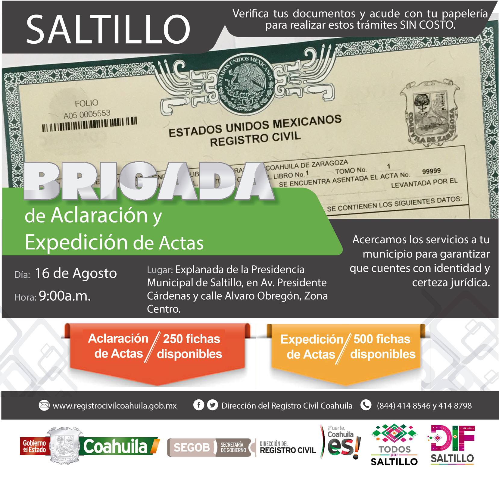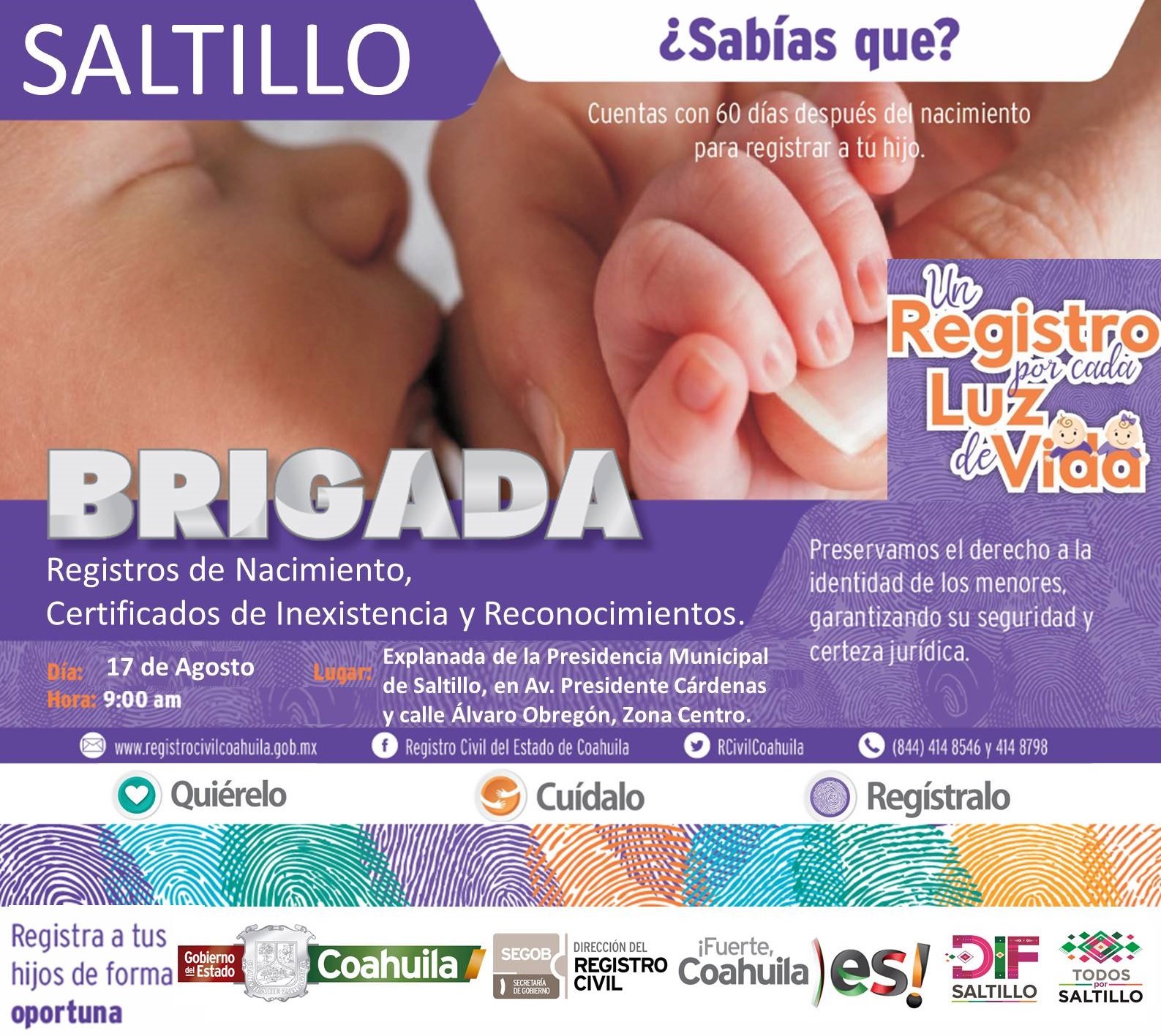 Con el objetivo de hacer llegar sus servicios, el Gobierno del Estado y el Municipio de Saltillo —a través de la Dirección del Registro Civil en Coahuila y del DIF Saltillo— invitan a la población a participar en las brigadas que se realizarán este 16 y 17 de agosto, sin costo.