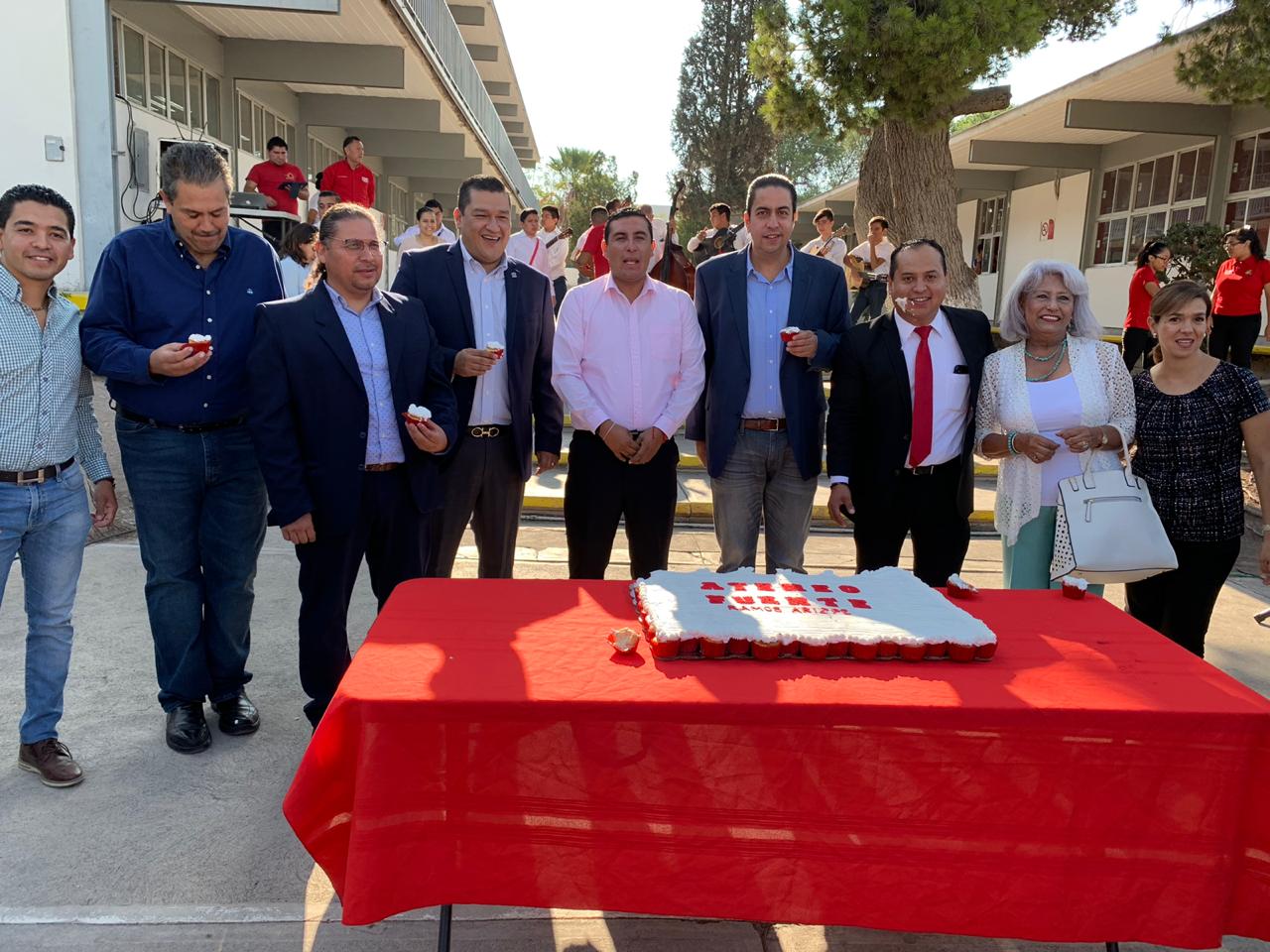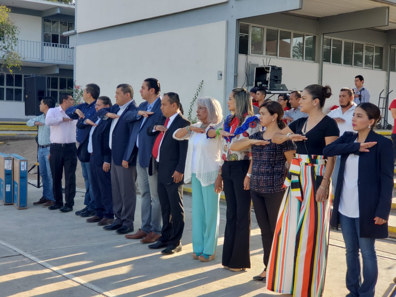 “Estuvimos acompañándolos en una ceremonia cívica de honores a la bandera al Ateneo de Ramos en el marco de su 17 aniversario como institución educativa en el municipio y aparte estuvimos también aprovechando para entregar apoyos del programa Escuelas al 50”, dijo Morales Padilla.