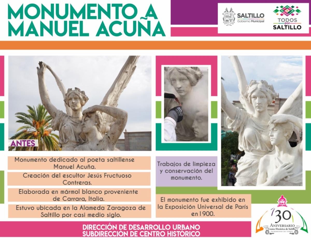 Como parte de las actividades del 30 aniversario del Centro Histórico de Saltillo, que se conmemoró el pasado 20 de junio, se concluyeron las acciones de limpieza y conservación del monumento al poeta saltillense Manuel Acuña, en la plaza del mismo nombre.