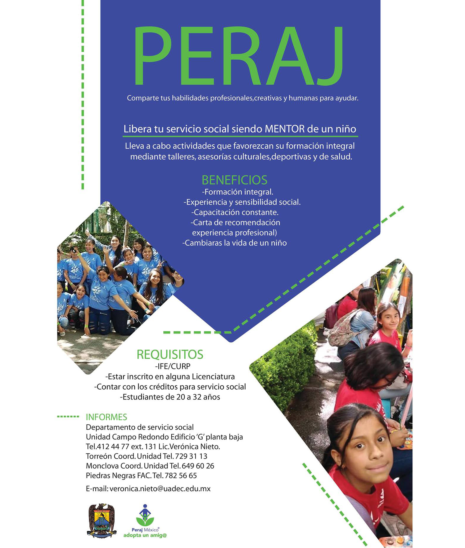 Si eres estudiante de licenciatura de la Universidad Autónoma de Coahuila, cuentas con los créditos para realizar Servicio Social, tienes entre 20 y 32 años, el Programa Peraj te invita a formar parte de su equipo en las Unidades Saltillo, Torreón y Norte.