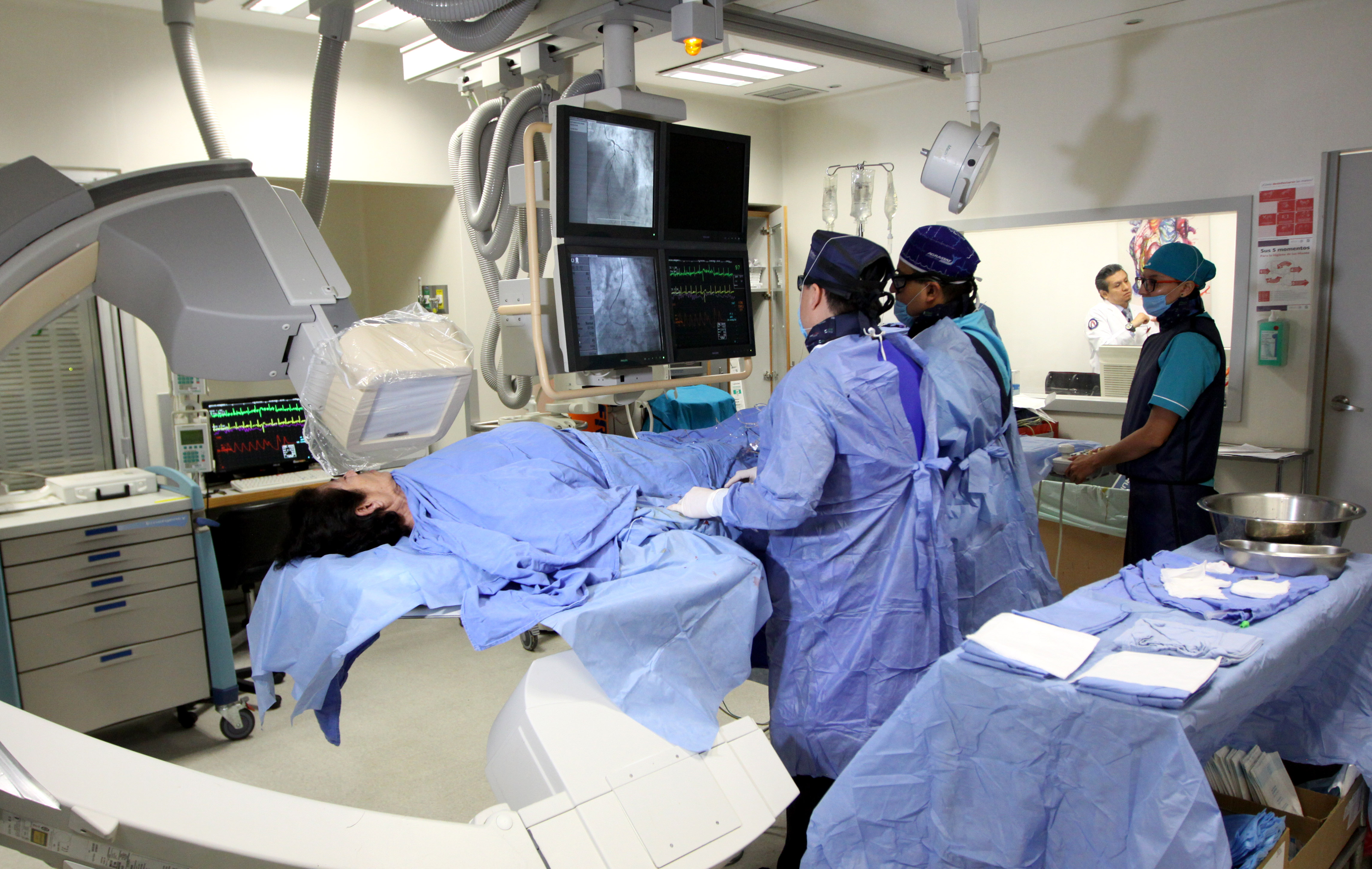 Detalló que en esta sala se practican cateterismos, es decir, un procedimiento que se aplica por medio de una pequeña punción en la muñeca para introducir un dispositivo en forma de tubo estrecho y alargado (similar a una manguera pequeña) llamado catéter, a fin de verificar qué arterias del corazón están tapadas e intentar desbloquearlas.