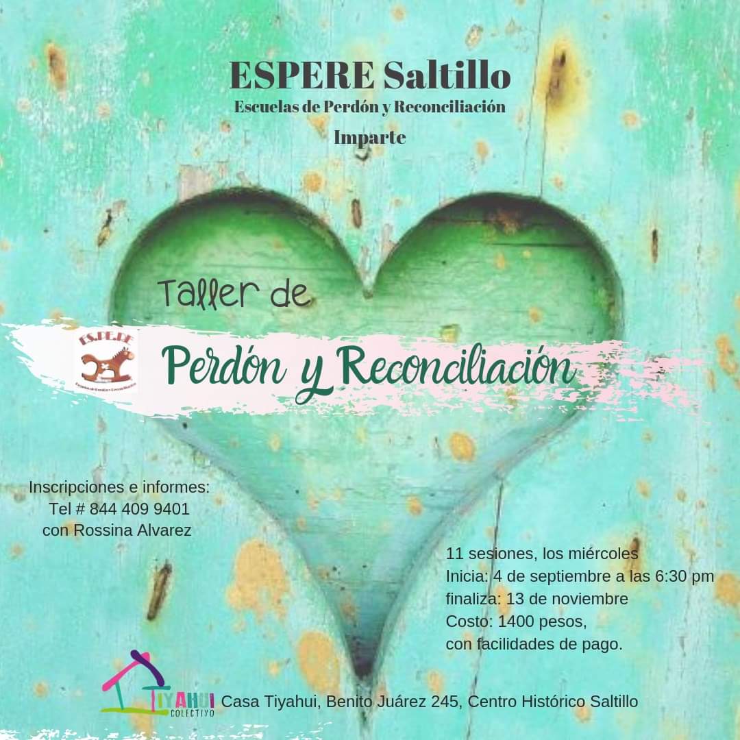 El Taller de «Perdón y Reconciliación», organizado por el colectivo Escuelas de Perdón y Reconciliación en Saltillo (ESPERE), llegará a Casa Tiyahui (Juárez 245. Centro Histórico), este próximo 4 de septiembre a partir de las 6:30 de la tarde, con la misión de enseñar a los asistentes a manejar sus emociones para su beneficio.