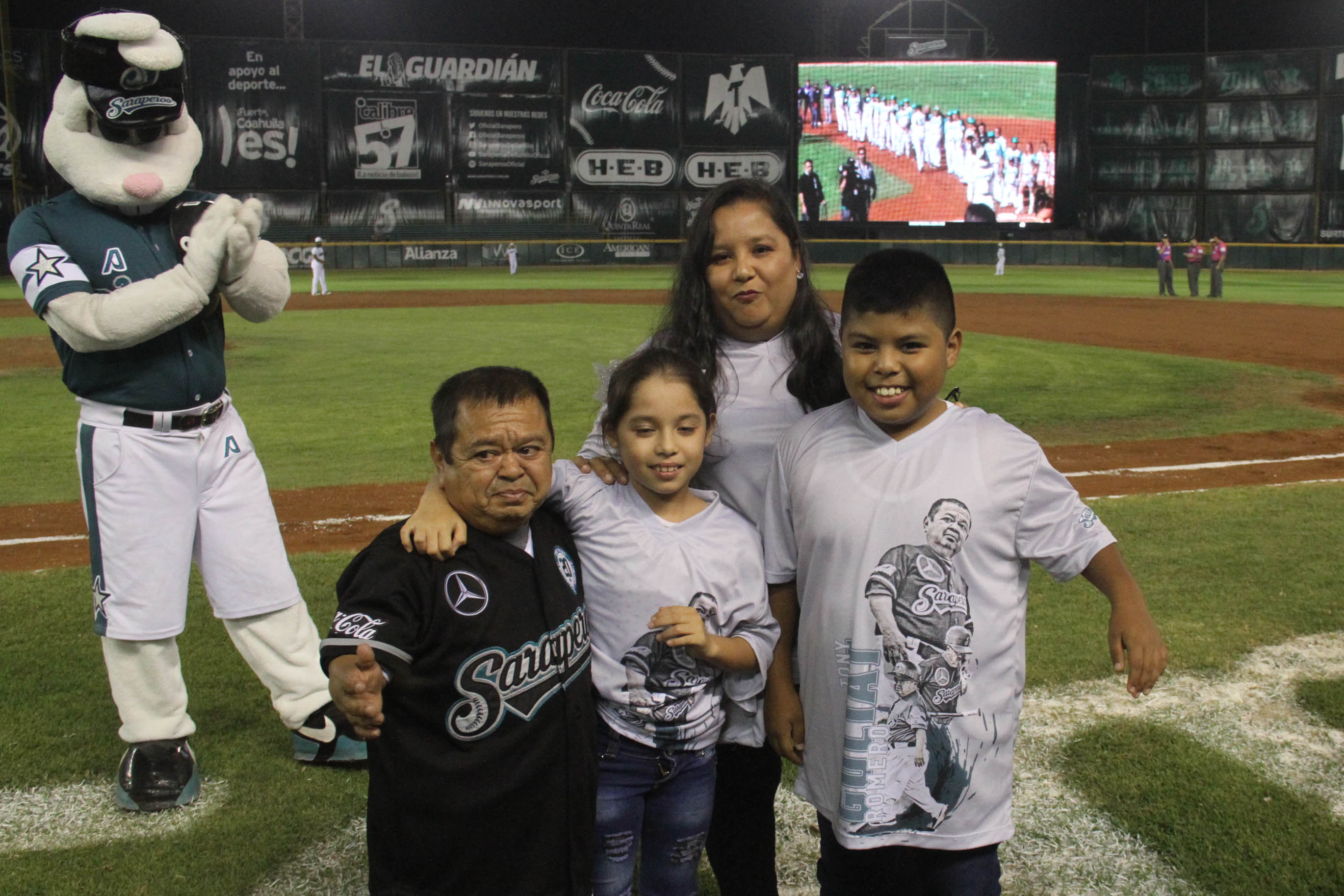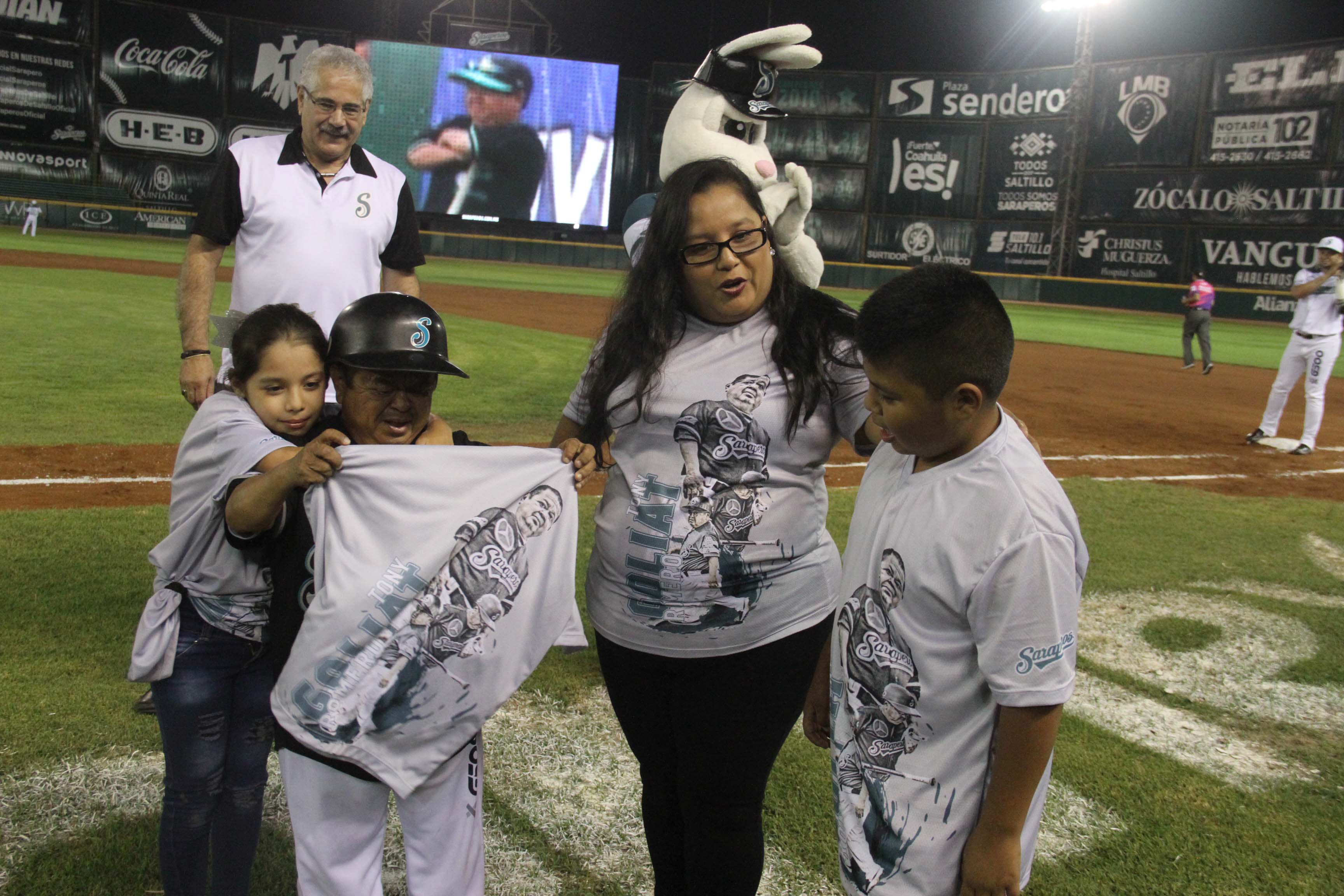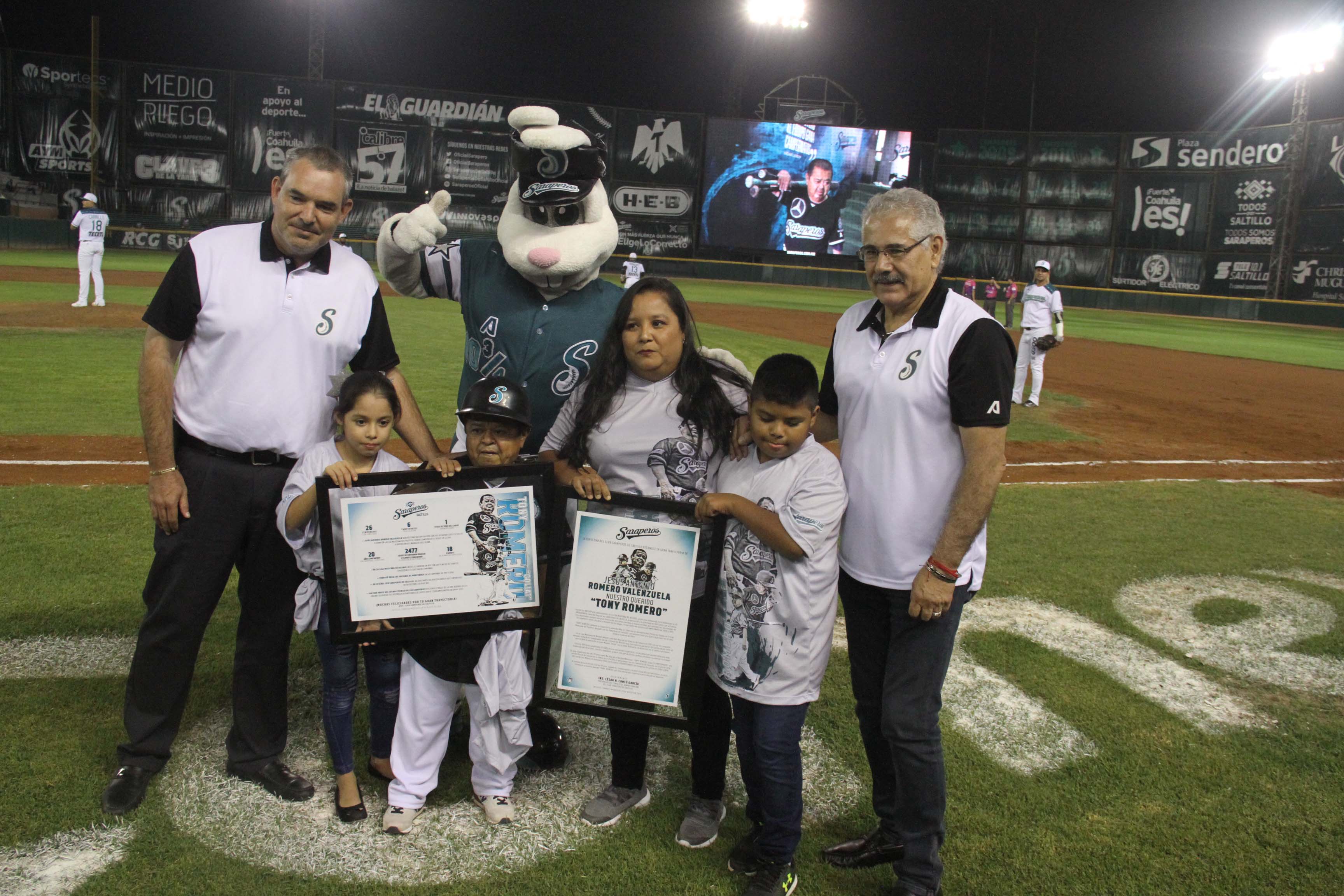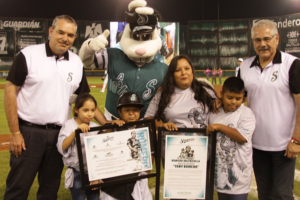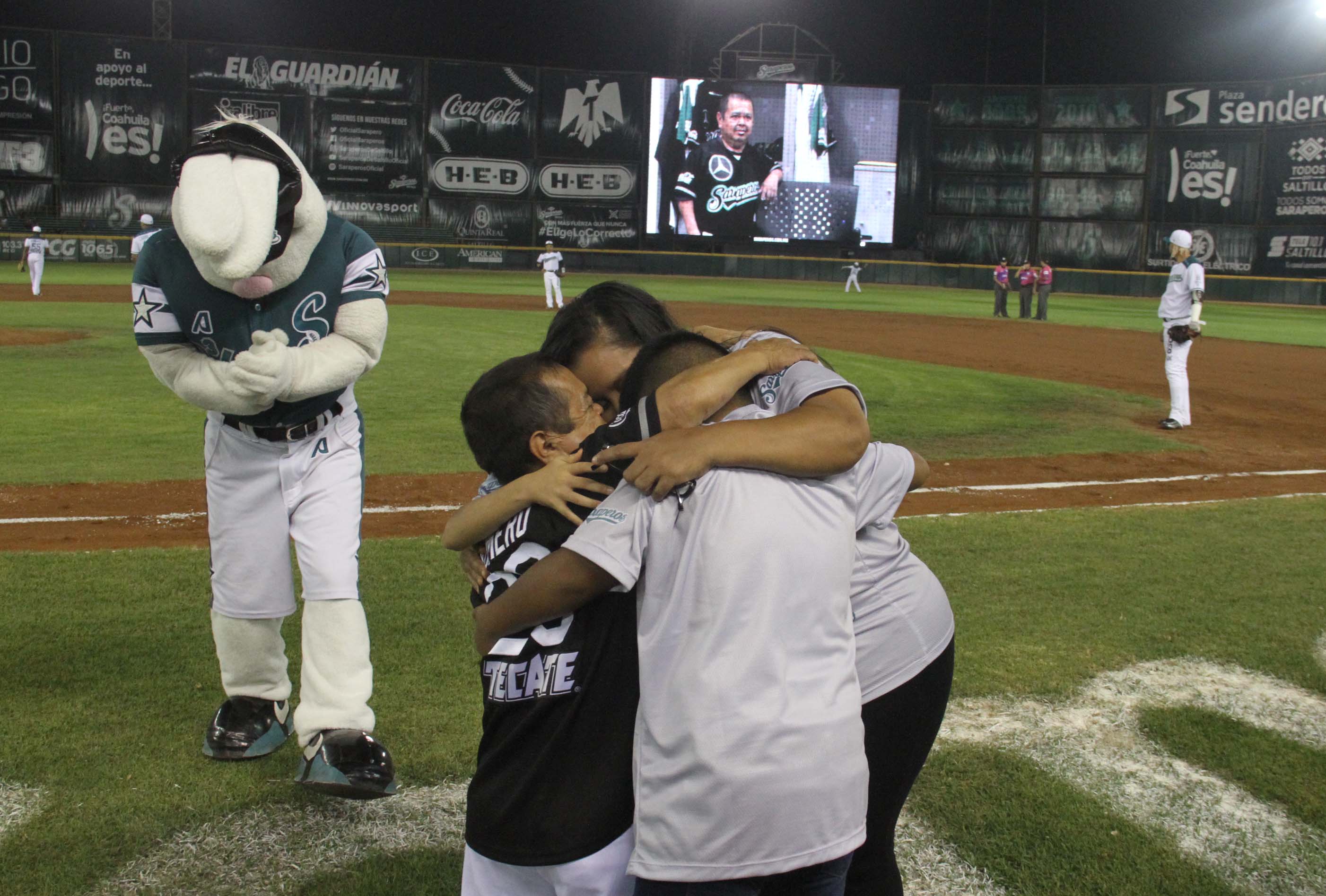 Fue el protagonista de la noche, con un homenaje sorpresa que preparó la directiva saltillense, trayendo a su esposa Oneyda Gómez de Romero y a sus pequeños Camila y Herberto Romero Gómez, quienes lo sorprendieron uniéndose en un emotivo abrazo en la quinta entrada en su parte alta, mientras se mostraba un video de su trayectoria, robando las miradas de los aficionados que brindaron una sonora ovación a “Tony” Romero que se emocionó hasta las lágrimas.