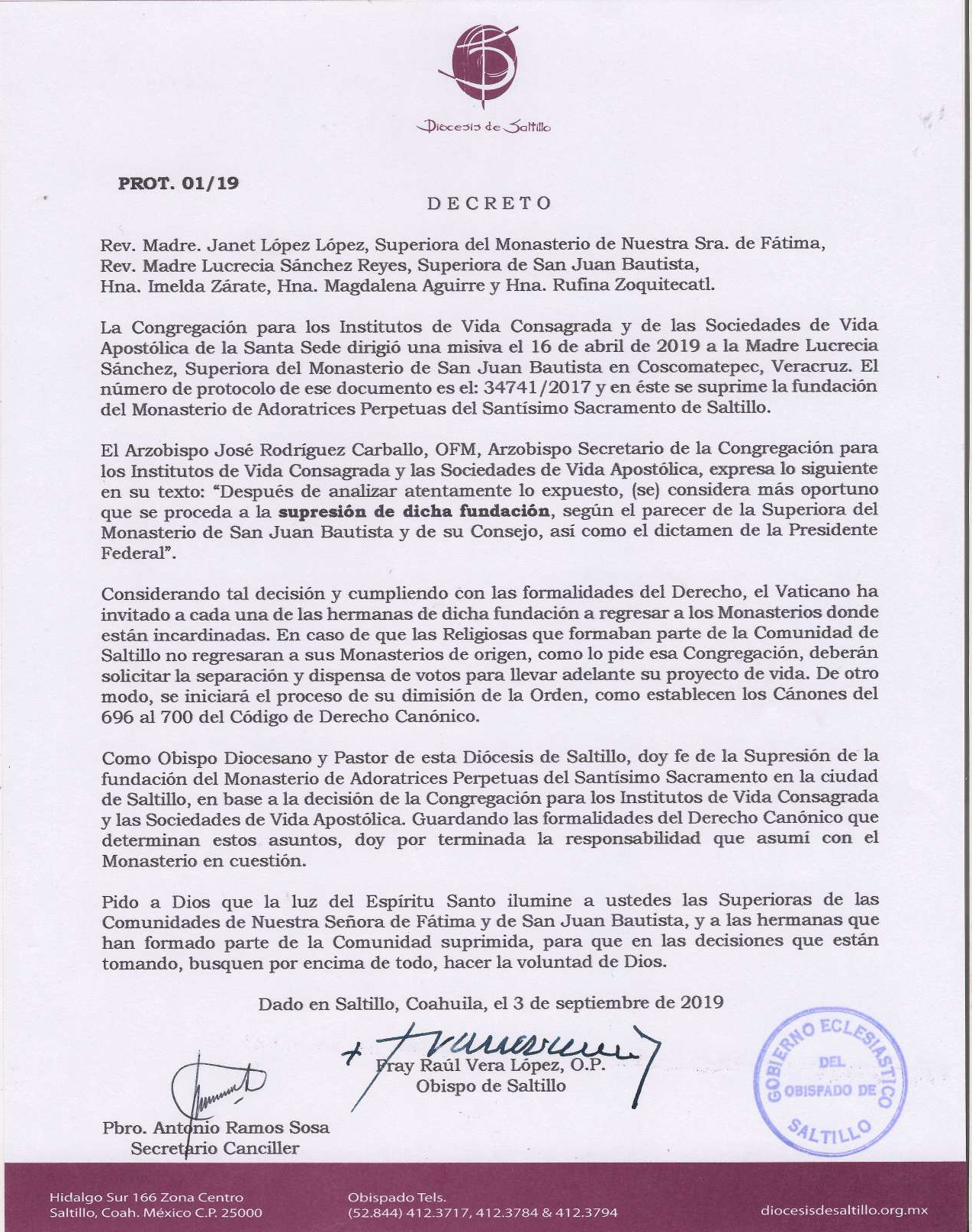 Luego de que las religiosas que forman parte del Monasterio de Adoratrices Perpetuas del Santísimo Sacramento de Saltillo se negaran a entregarle al Obispo Raúl Vera López un terreno que recibieron en donación para la construcción de su monasterio en nuestra ciudad, éste martes la Diócesis de Saltillo emitió un comunicado en el que da cuenta de que el Obispo emitió un decreto para suprimir esa congregación, acto que se puede interpretar claramente como una represalia en contra de las religiosas por haberse negado a entregar el terreno que recibieron en donación.