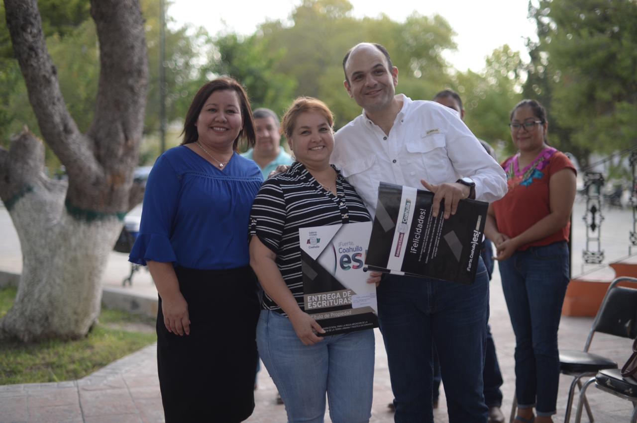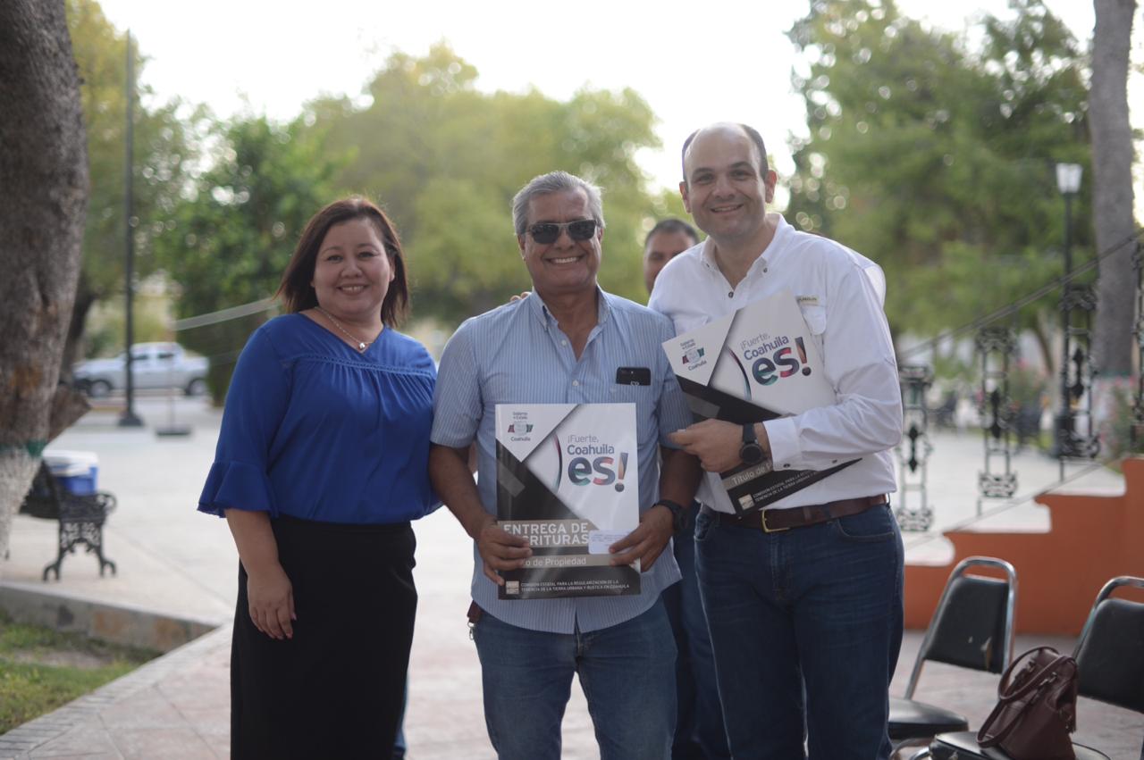 El titular de la dependencia, acompañado del Alcalde de este Municipio, Édgar Ramón Tavares Olivas, y del Director de la Comisión Estatal para la Regularización de la Tenencia de la Tierra Urbana y Rústica de Coahuila (CERTTURC), Miguel Ángel Leal Reyes, entregó 31 escrituras.