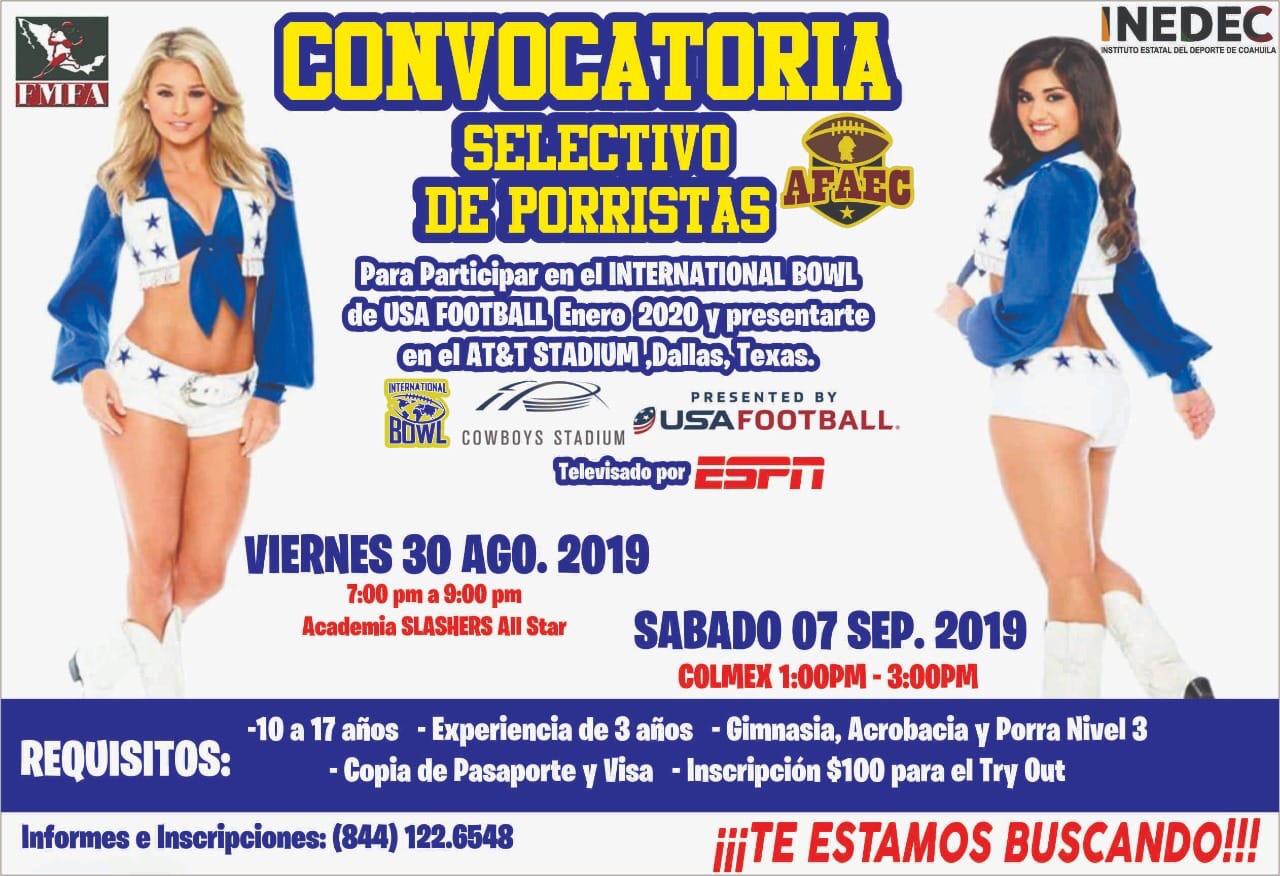 El Instituto Estatal del Deporte de Coahuila (INEDEC) en sinergia con la Federación Mexicana de Futbol Americano (FMFA) y la Asociación de Futbol Americano del Estado de Coahuila (AFAEC), invitan a porristas locales de 10 hasta 17 años de edad, a participar en la segunda fecha del selectivo para representar a la entidad en el International Bowl de USA Football, a celebrarse en el AT&T Stadium de Dallas, Texas, en enero de 2020.