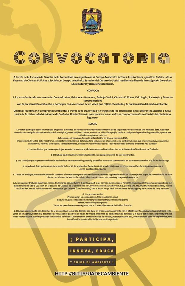 Torreón.- La Escuela de Ciencias de la Comunidad y la Facultad de Ciencias Políticas y Sociales de la Universidad Autónoma de Coahuila Unidad Torreón, convocan a los estudiantes de las carreras de Comunicación, Relaciones Humanas, Trabajo Social, Ciencias Políticas, Psicología, Sociología y Derecho a participar en la creación de un video que refleje el cuidado y la preservación del medio ambiente.
