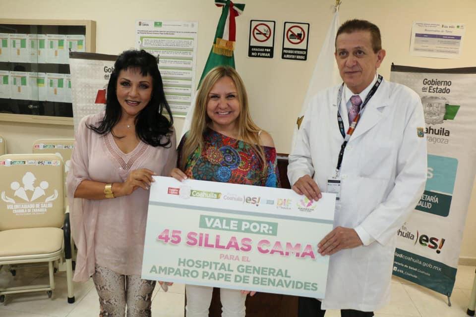 Monclova, Coah.- La Presidenta Honoraria del DIF Coahuila, la señora Marcela Gorgón, entregó 45 sillas-cama al Hospital General Amparo Pape de Benavides, que permitirán a las personas descansar mientras cuidan del estado de salud de sus familiares o conocidos internados.