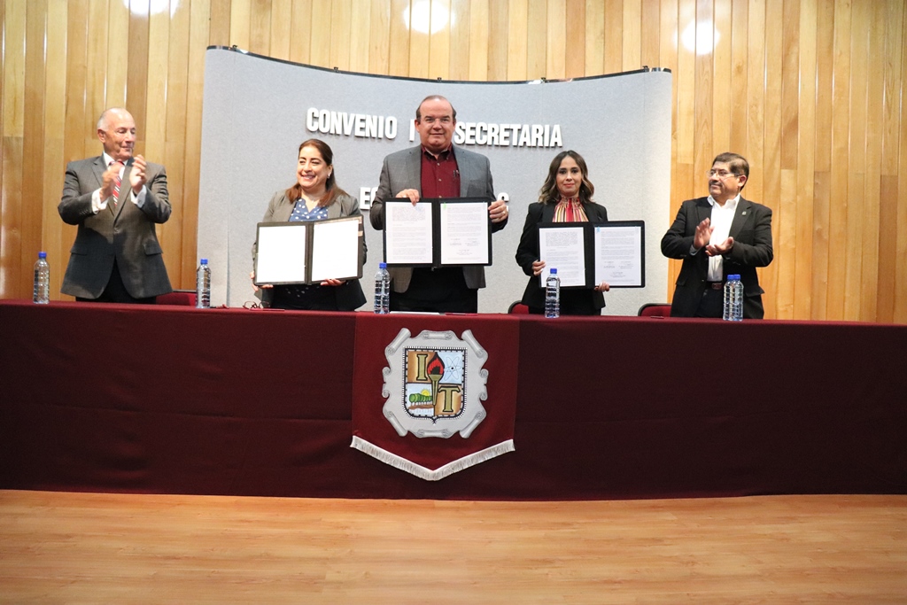 En el evento estuvieron presentes la Directora del ITS, María Gloria Hinojosa Ruiz; en representación del Secretario de Educación asistió Eduardo José Hochmann; además la representante legal de NEMT Register, Cinthia Elizabeth Aparicio Lemus, y el subdirector de Planeación y Vinculación del ITS, Armando Nuncio, y fue llevado a cabo en el auditorio del instituto.