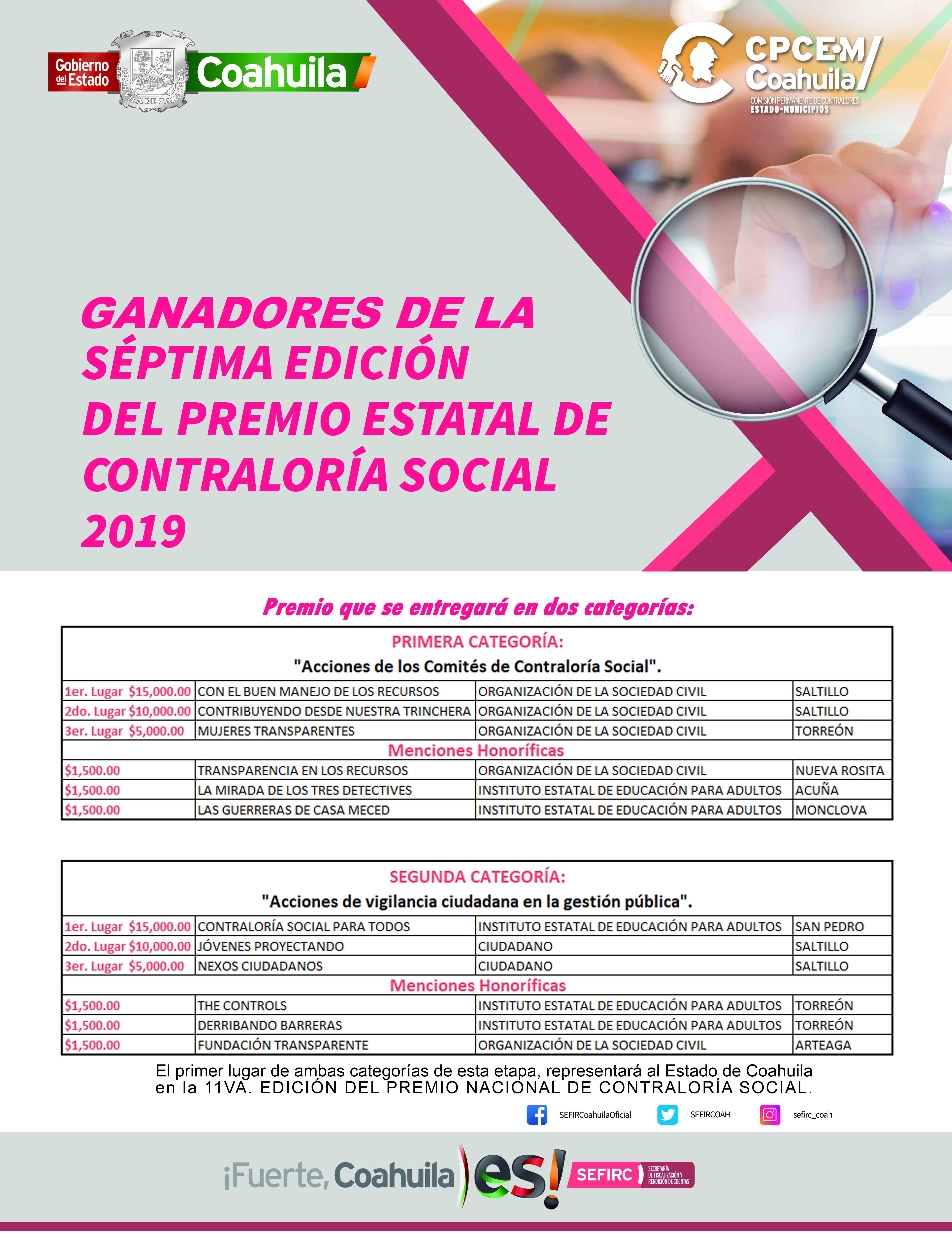 El primer lugar de cada categoría representará al Estado de Coahuila en la onceava edición del “Premio Nacional de Contraloría Social 2019”.