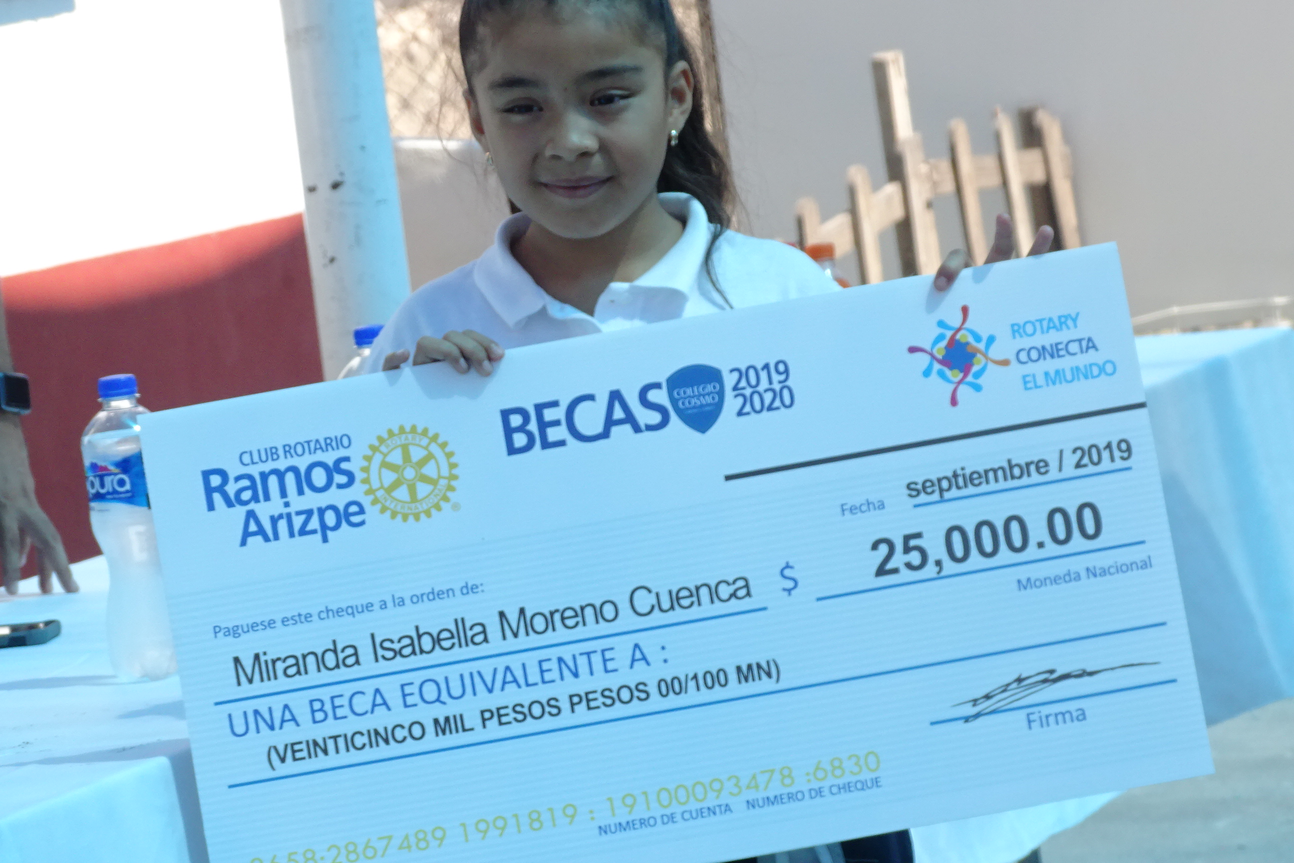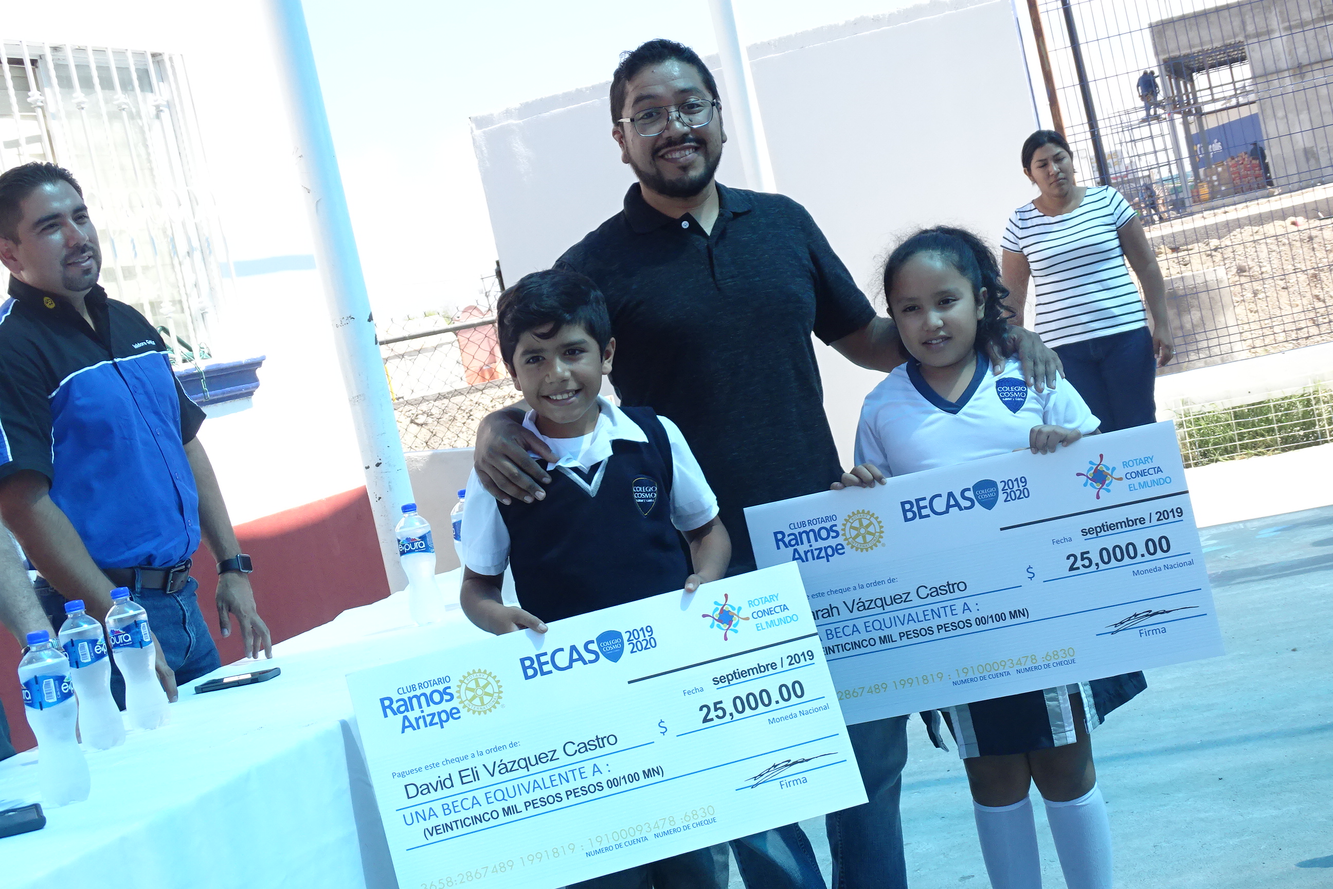 Este jueves, el Club Rotario de Ramos Arizpe hizo entrega de cinco becas estudiantiles a alumnos del Colegio COSMO, así como de materiales didácticos para la estimulación temprana a tres jardines de niños públicos y la entrega simbólica de260 pupitres donados por el Liceo Alberto del Canto fueron entregados a escuelas y tele secundarias de los ejidos.