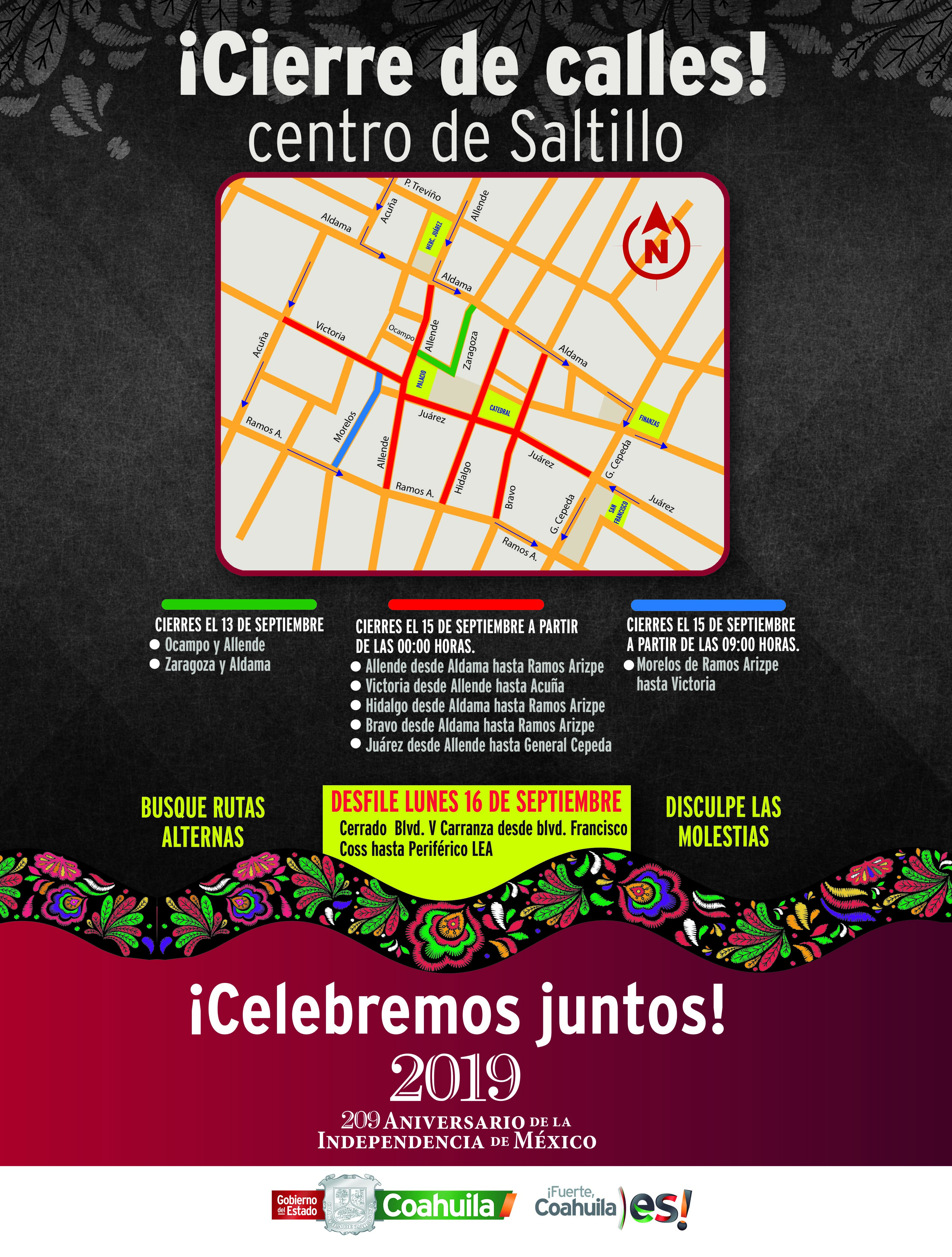 El domingo 15 de septiembre, desde las 00:00 horas se cerrarán al tránsito vehicular las calles aledañas a Plaza de Armas: Hidalgo, en su tramo de Ramos Arizpe a Aldama; Juárez, de General Cepeda a Allende; Bravo, de Ramos Arizpe a Aldama; Allende, de Aldama a Ramos Arizpe; y Victoria, de Allende a Acuña, mismas que se reabrirán una vez que termine el evento.
