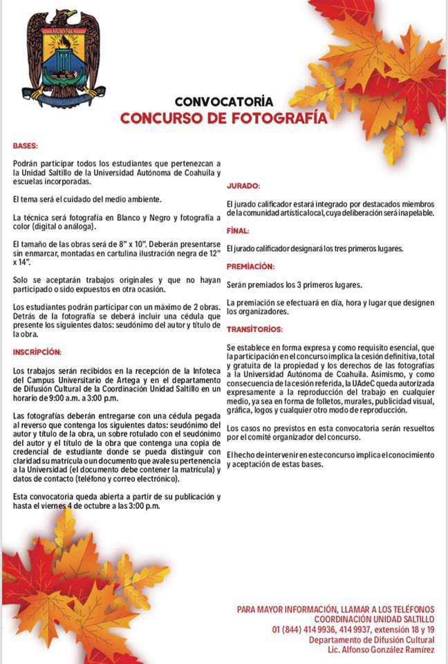 La Coordinación de la Unidad Saltillo de la Universidad Autónoma de Coahuila invita a los estudiantes de la máxima casa de estudios y de escuelas incorporadas a participar en el concurso de fotografía con temática ambiental.