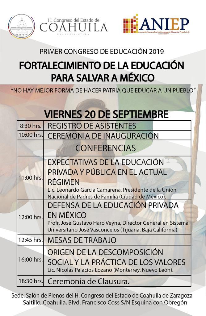 El Congreso del Estado de Coahuila será sede del Primer Congreso de Educación 2019 “Fortalecimiento de la Educación para Salvar a México”, el próximo 20 de septiembre la capital coahuilense.