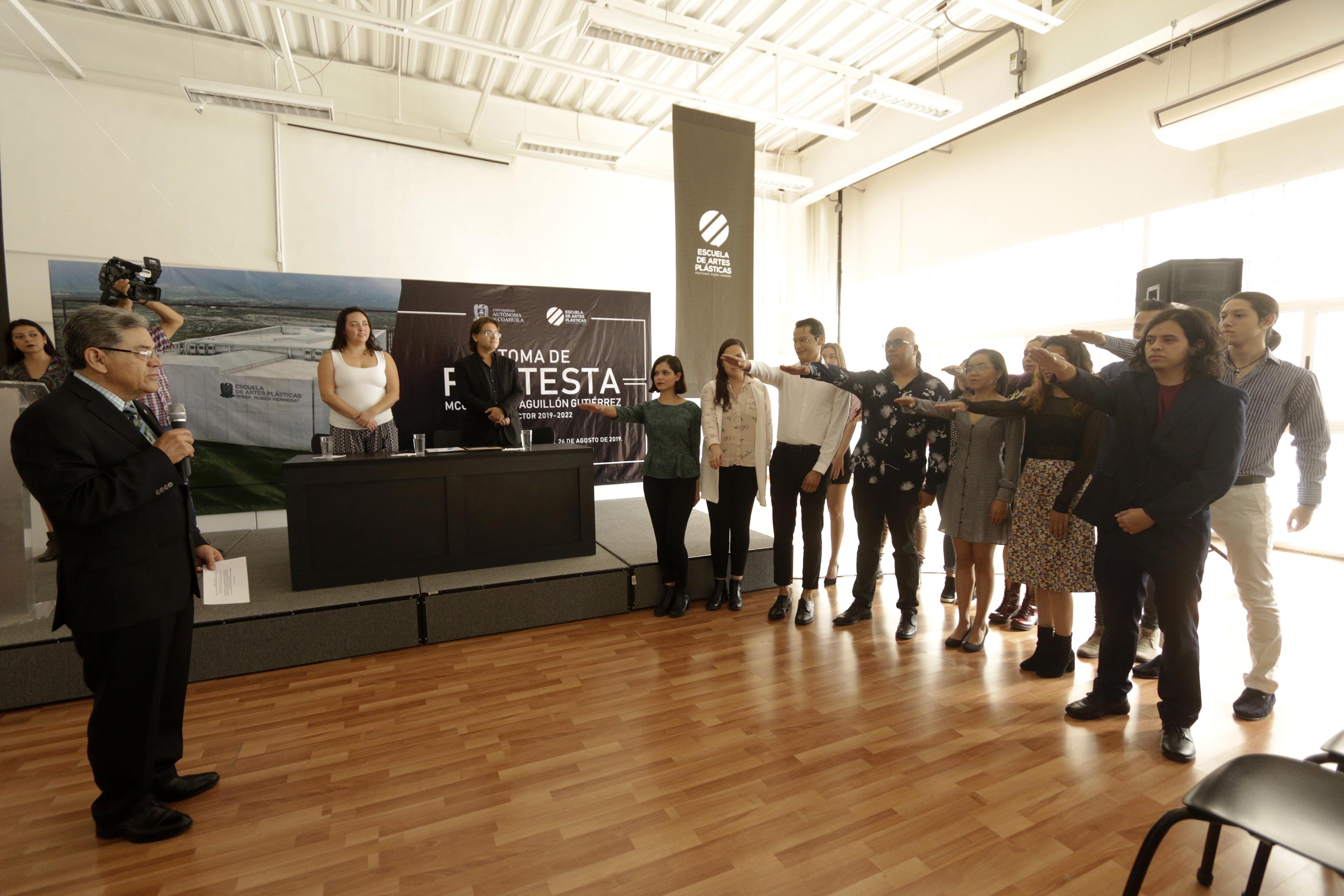 La ceremonia de toma de protesta tuvo lugar en el salón de usos múltiples del plantel, donde se contó con la presencia del rector de la máxima casa de estudios, Salvador Hernández Vélez, el director de la EAP, Darío D. Aguillón Gutiérrez, la secretaria académica, Edén Calvillo Martínez, los integrantes de la Sociedad de Alumnos y estudiantes de las carreras de Licenciatura en Diseño Gráfico y Artes Plásticas.